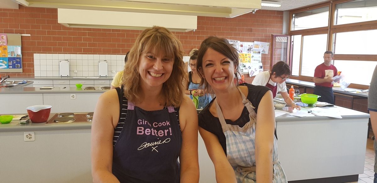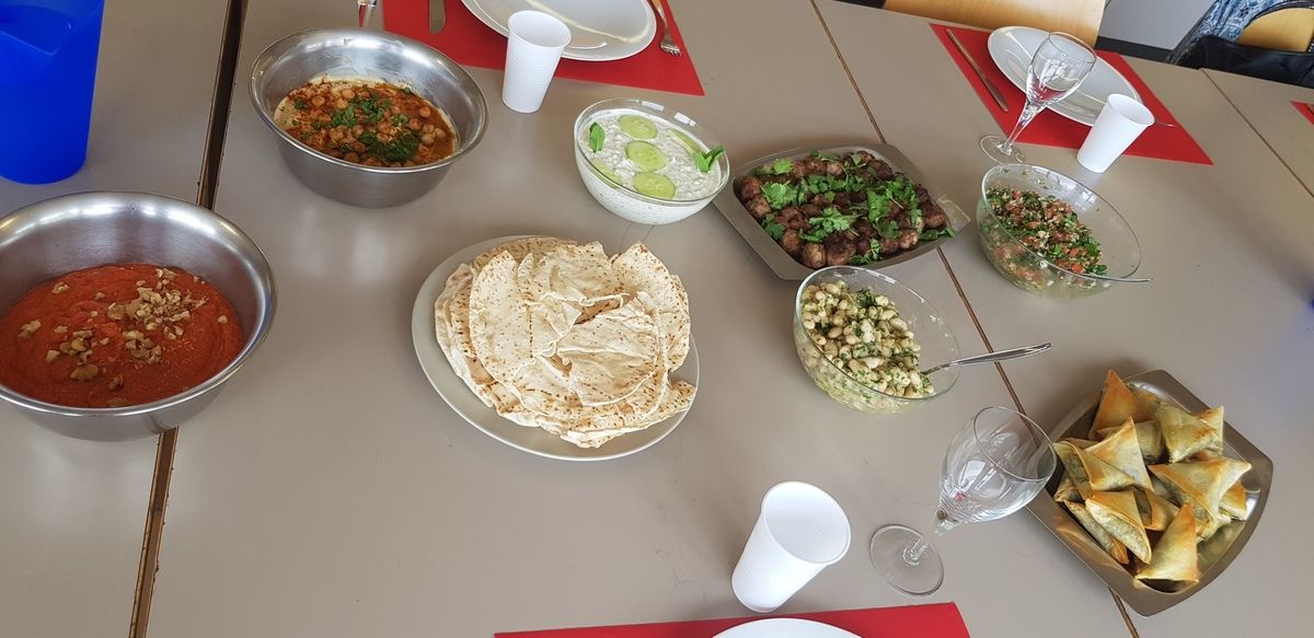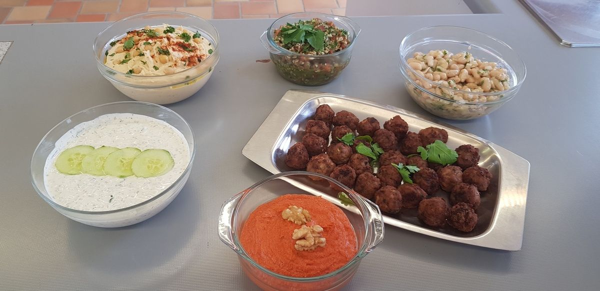 Un super cours sur les mezze libanais. Une équipe très chouette comme d'hab. Au menu des boulettes kefta, une sauce yaourt, concombre et menthe, un purée de poivrons aux noix, des samossas au fromage de chèvre, épinards et pignons,une salade de haricots blancs, de l'hommos et un taboulé libanais. MIAM!