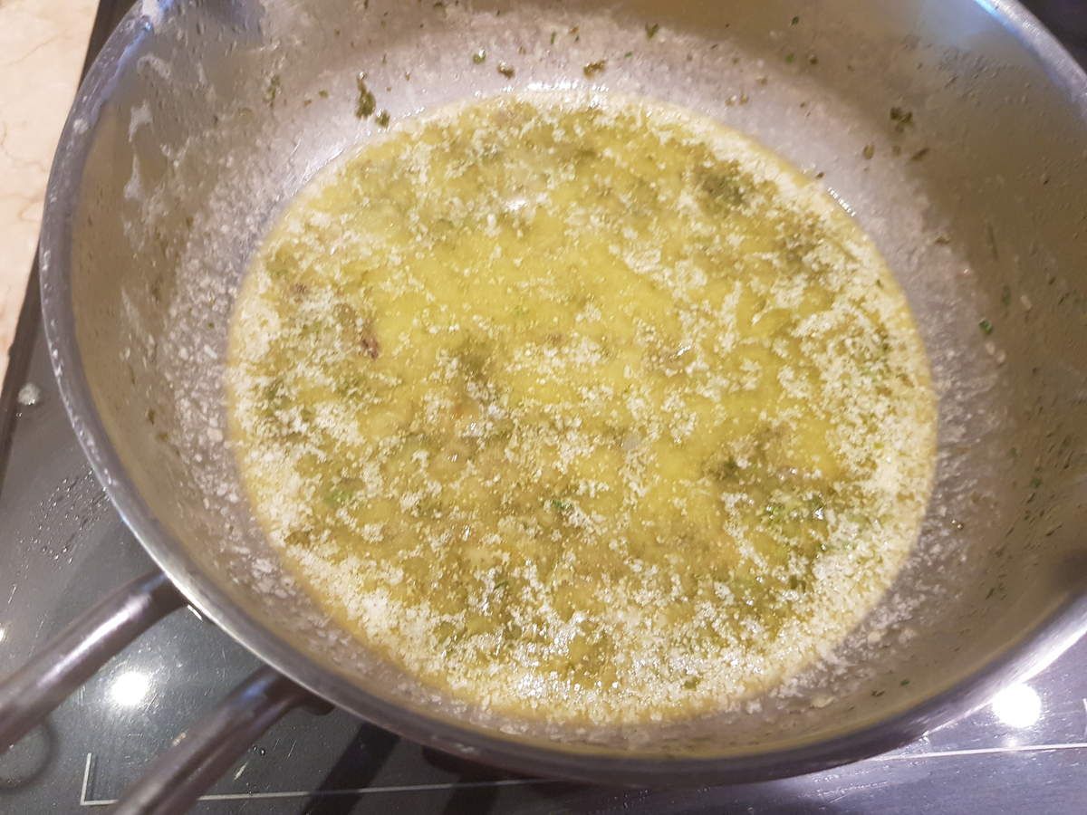3) Pendant ce temps, mettre les beurres à fondre tout doucement dans une casserole. Hacher le persil. Lorsque le beurre est fondu, ajouter 3 càs de câpres égouttées, 2 càc de jus de citron puis ajouter la moitié du persil. Laisser cuire sur feu très doux.