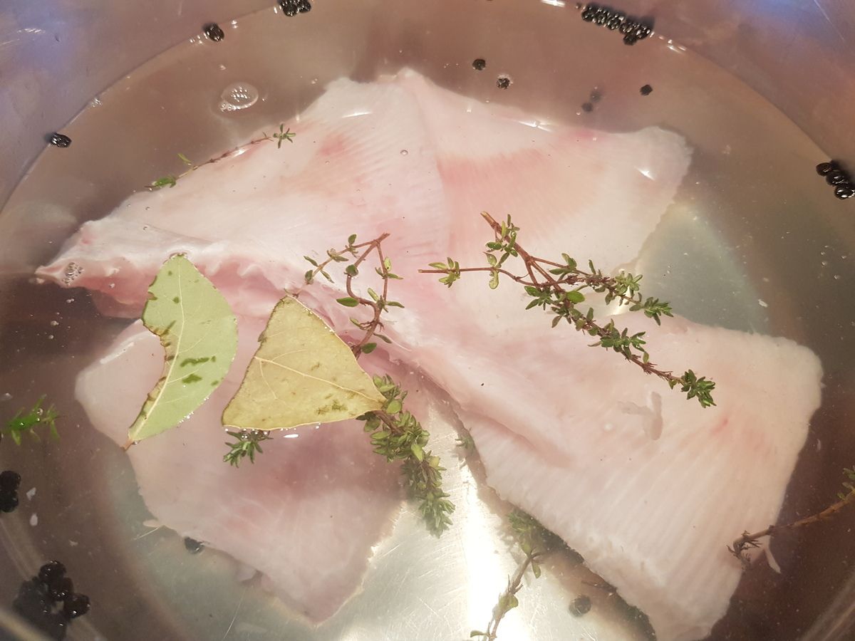 1) Rincer les raies parées (peau enlevée) à l'eau froide et les frotter doucement pour les nettoyer (de temps en temps, cela ne fait pas de mal...). Leur donner une jolie forme régulière et les couper en deux.