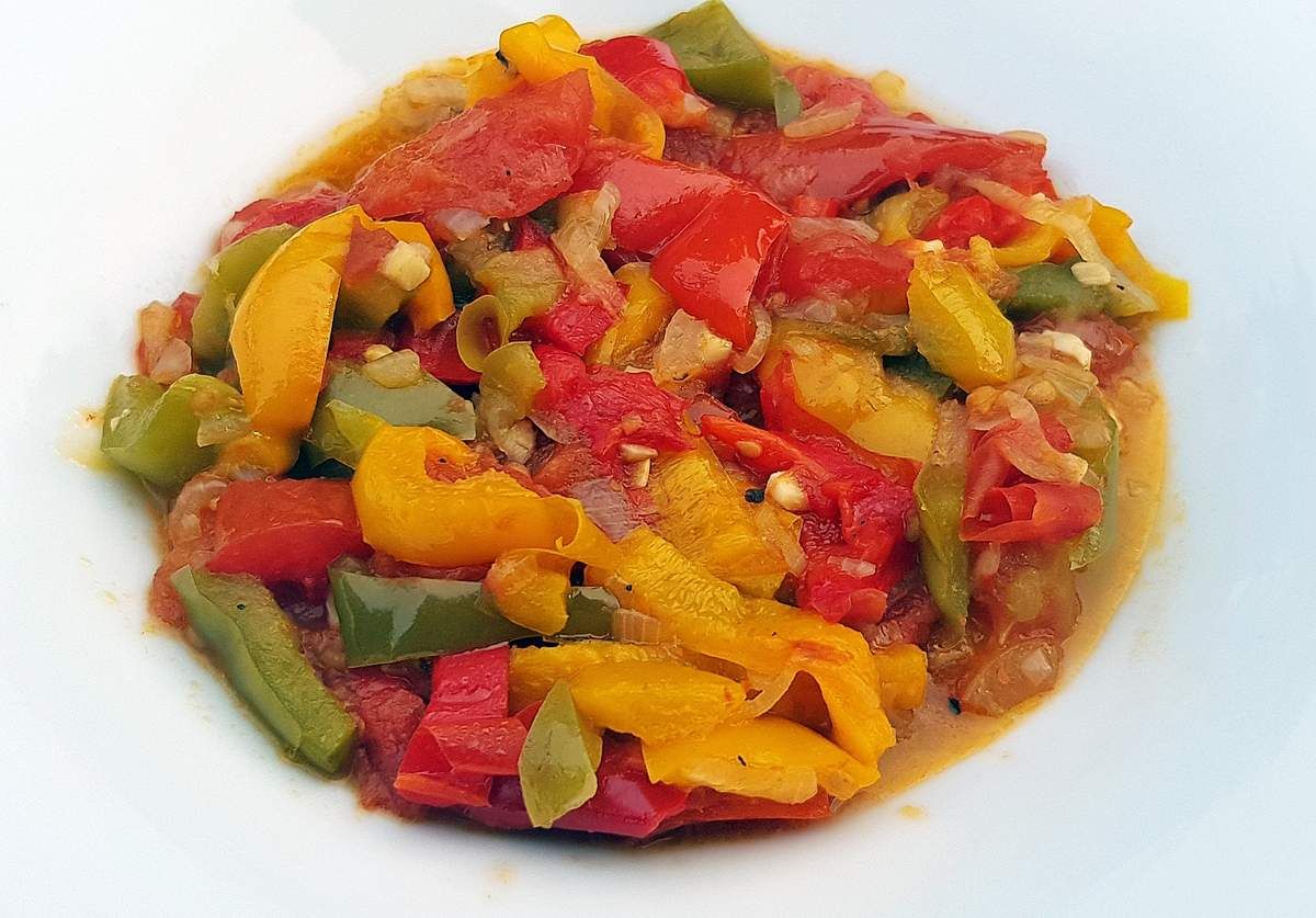 Cette piperade réalisée avec des poivrons rouges, verts et jaunes, des tomates, de l'oignon, de l'ail, bien compotée, fait penser à sa copine la ratatouille (ma recette ICI). L'huile d'olive est à l'honneur c'est certain. A ce sujet, ne soyez pas radins avec l'huile d'olive dans cette recette, c'est ce qui fait tout son charme, entre autres.