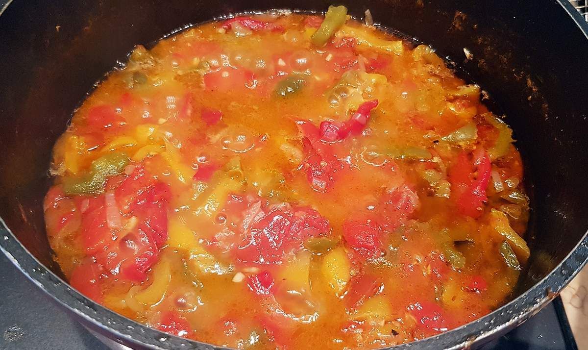 1) Eplucher les oignons, les couper en deux puis en lamelles. Peler les gousses d'ail et les hacher. Rincer les poivrons sous l'eau froide, les sécher puis les couper en deux. Retirer le centre avec les pépins et le pédoncule. Les couper en lanières. Rincer les tomates sous l'eau froide, les sécher puis les couper en deux, retirer le pédoncule et les couper en morceaux.