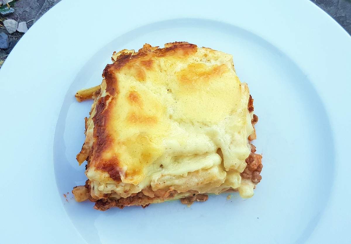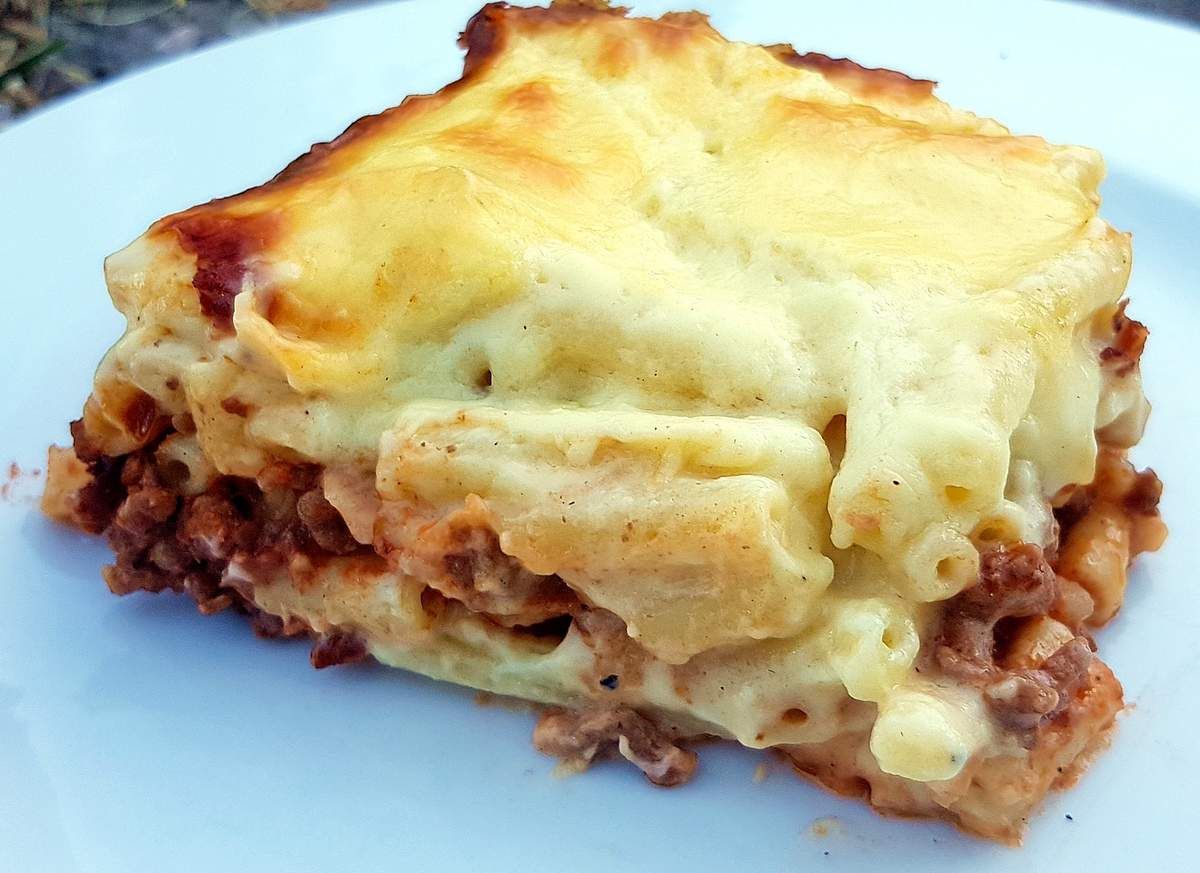 6) Préchauffer le four à 180°C. Dans un plat à gratin beurré, faire le montage: déposer d'abord la moitié des macaronis, puis la viande (lisser et tasser un peu), puis l'autre moitié des macaronis, puis la béchamel. Enfourner au milieu du four pour 30 à 40°C jusqu'à coloration de la béchamel. Si elle brunit trop en cours de cuisson, recouvrir avec une feuille d'alu. Sortir du four, laisser reposer 3 minutes et servir. MIAAAAAM!