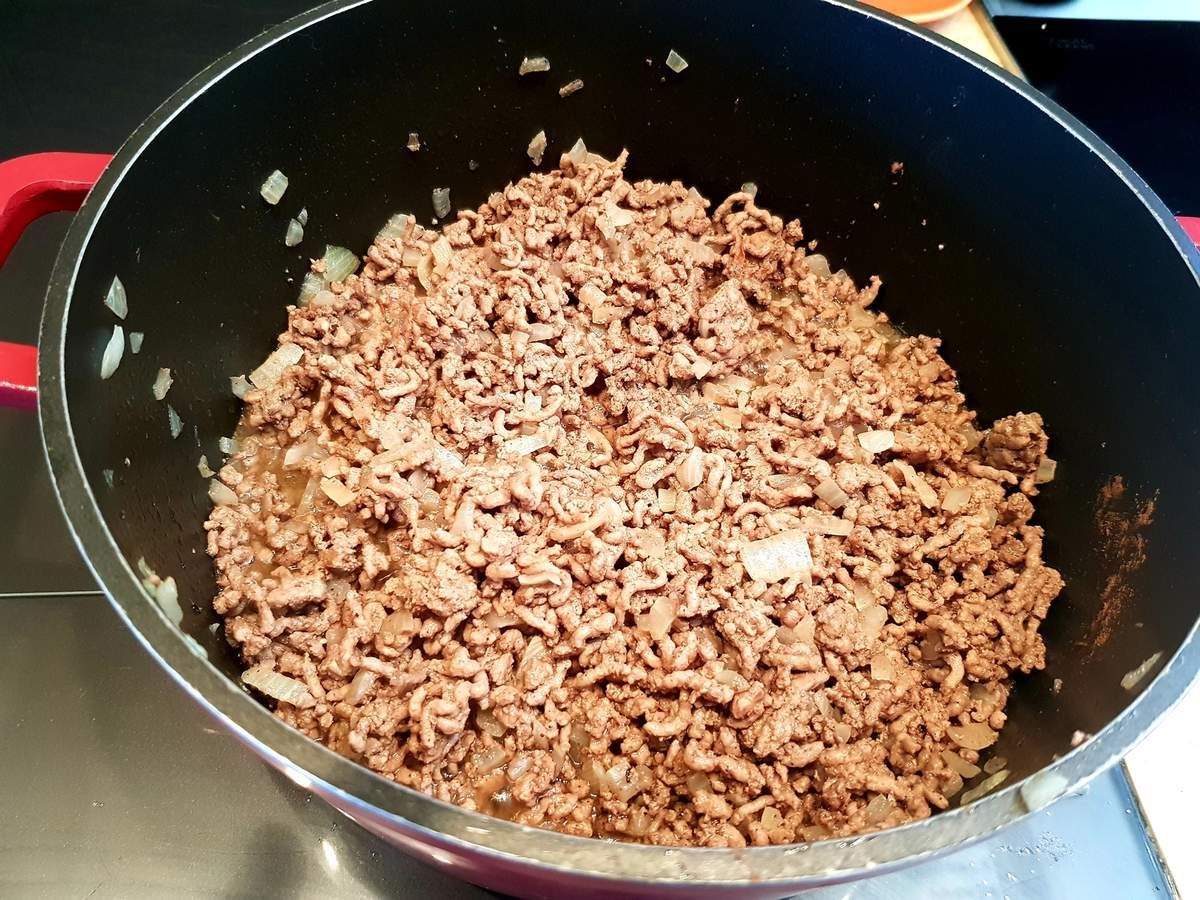 1) Peler et hacher l'oignon. Le faire revenir une minute dans une cocotte avec un peu d'huile d'olive. Ajouter les viandes. Faire revenir le tout en mélangeant pendant 10 minutes jusqu'à ce que la viande soit dorée.
