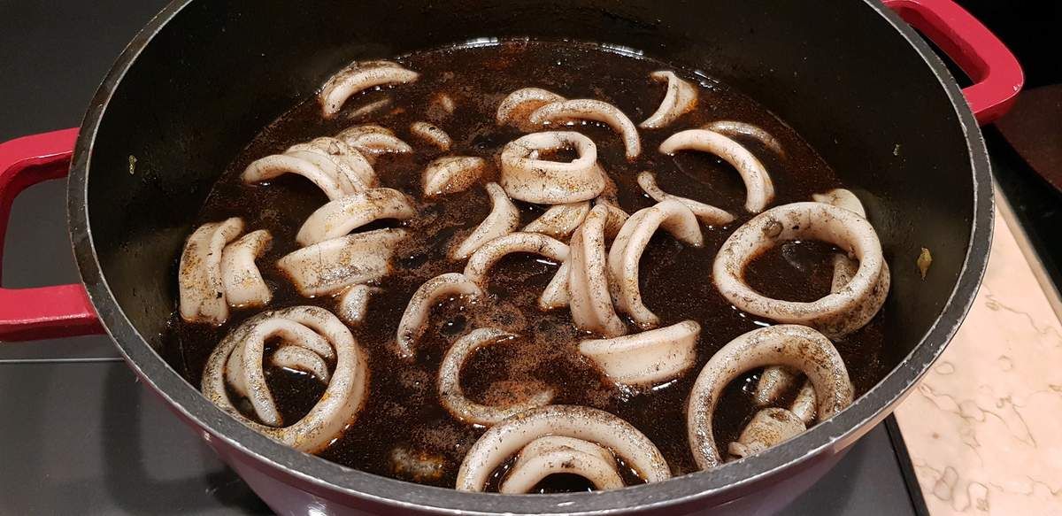 3) Dans une poêle haute ou dans un faitout, mettre à chauffer un filet d'huile d'olive puis faire revenir l'ail et l'oignon sur feu moyen-vif 2 minutes en mélangeant. Ajouter les anneaux de calamars, poivrer et mélanger. Faire revenir sur feu moyen-vif 5 minutes.