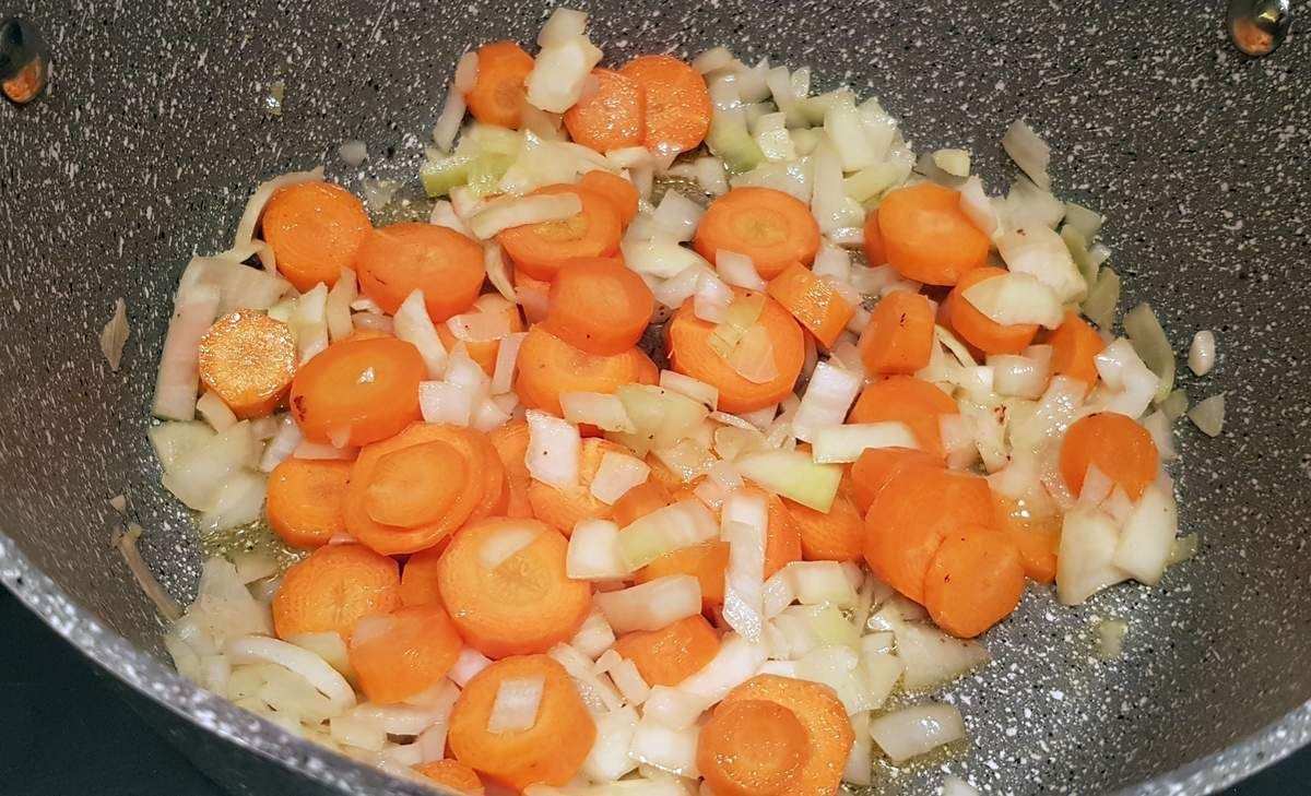 1) Préparer la sauce: peler les carottes et les couper en rondelles. Hacher les oignons et l'ail.