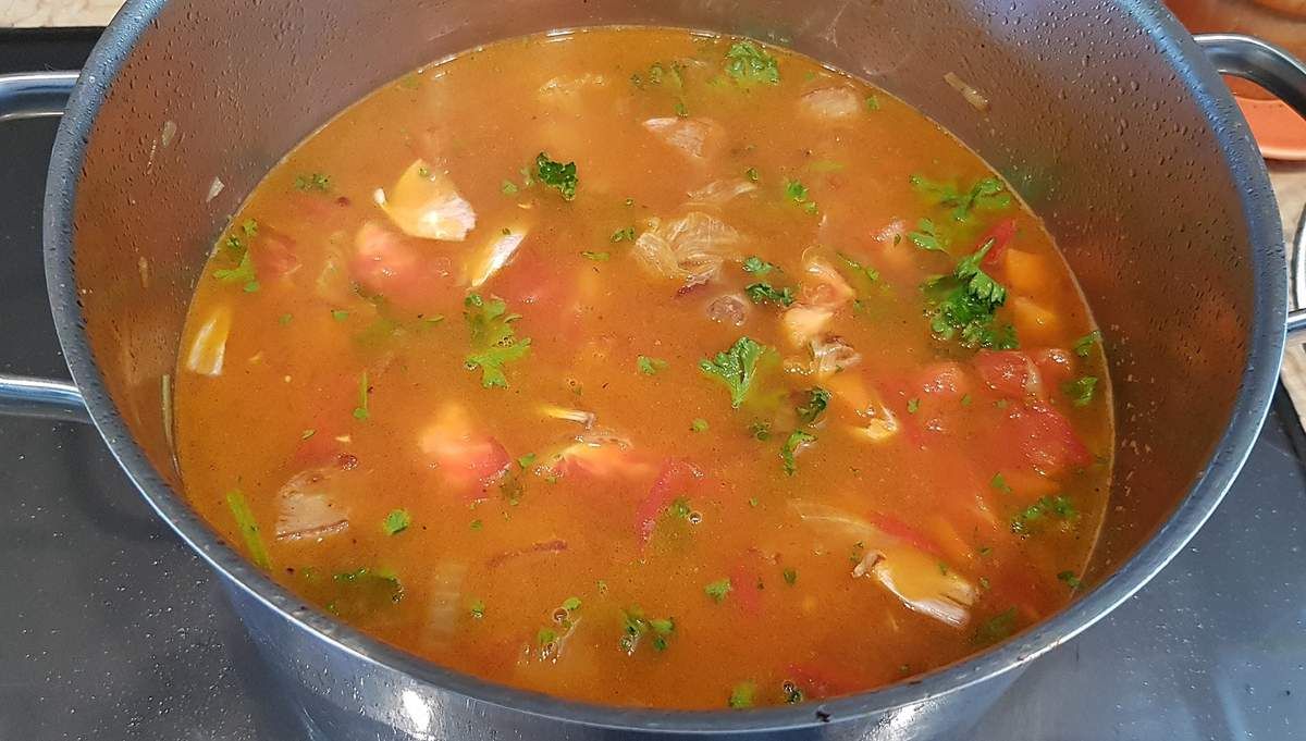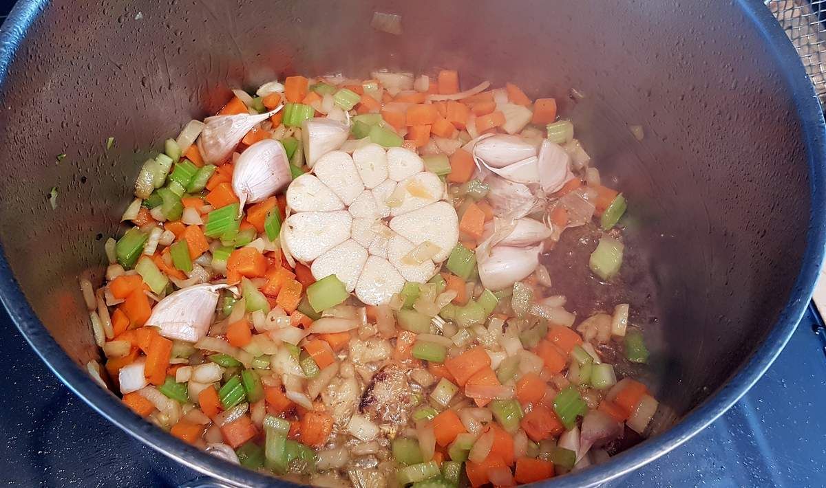 6) Dans la même casserole, remettre un peu d'huile d'olive à chauffer et faire revenir les carottes, le céleri et l'oignon une à deux minutes puis déglacer avec 1dl d'eau et bien gratter le fond avec une spatule pour décoller les sucs. Ajouter la tête d'ail coupée en deux, la feuille de laurier, les grains de poivre, une petite pincée de sel (pas plus car le jus va devenir salé en réduisant), le persil et la tomate coupée en morceaux. Ajouter 1,5 litre d'eau et remettre la viande dans la casserole. Porter à ébullition. A ébullition, baisser sur feu doux à frémissements et laisser réduire de moitié pendant environ 1 heure.