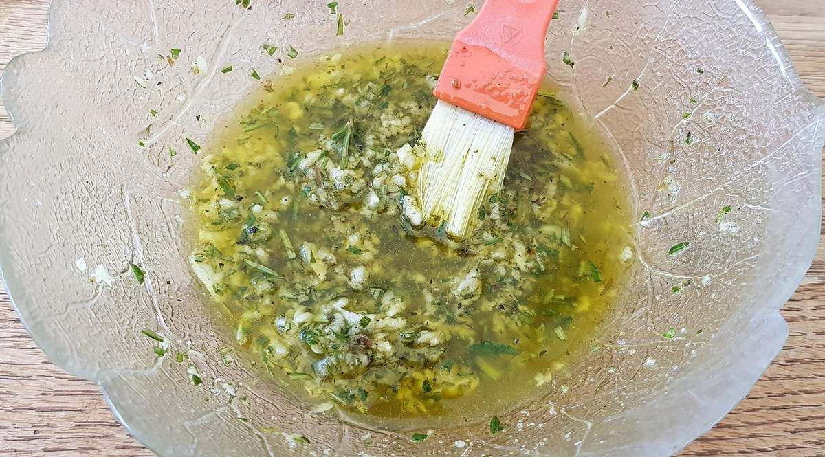2) Badigeonner le gigot de toutes parts avec un pinceau à pâtisserie ou avec les mains. Le laisser mariner au moins une heure à température ambiante (idéalement 2 heures) dans un plat allant au four.