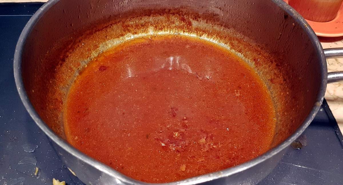 7) Lorsque le jus a réduit de moitié, le passer à travers un chinois pour le filtrer et le remettre dans la casserole. Le laisser encore réduire et épaissir environ 1 heure (plus ou moins), de façon à ce qu'il se concentre (aussi bien que vous). La quantité qu'il restera est d'environ 2dl. Goûter et rectifier l'assaisonnement en sel si nécessaire.