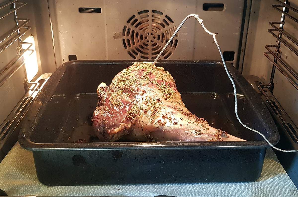 3) Après le temps de marinade du gigot, préchauffer le four à 240°C. Insérer un thermomètre à viande ou une sonde dans le gigot, à coeur, mais pas collé à l'os. Enfourner le gigot pour 10 minutes. Puis ouvrir la porte du four 2 minutes en baissant la température du four à 80°C. Ainsi la chaleur descend plus vite. Refermer la porte et laisser cuire le gigot environ 2 heures 30 à 3 heures. La température à coeur doit être à 60°C.