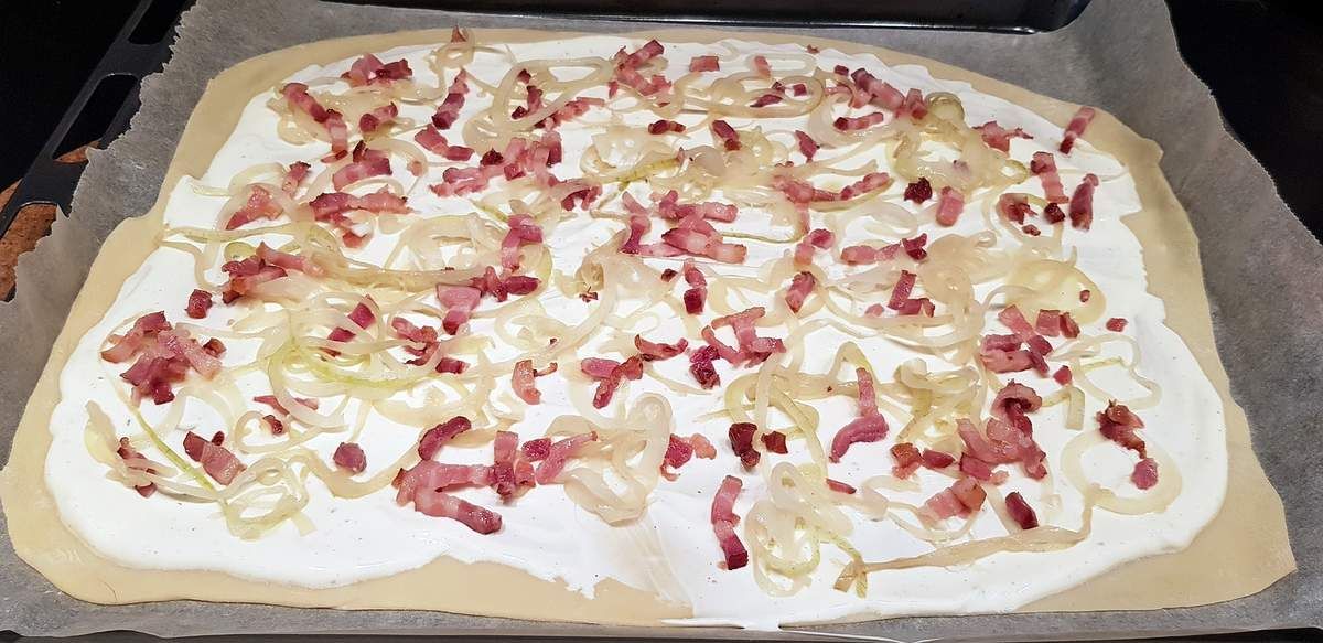 6) Déposer la pâte avec la feuille de papier sulfurisé sur la plaque. Répartir 4 à 5 belles cuillères à soupe de crème sur la pâte, la moitié des lardons et la moitié des oignons. Laisser les bords libres sur un centimètre maximum.
