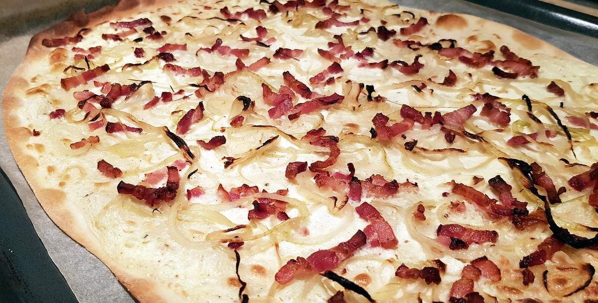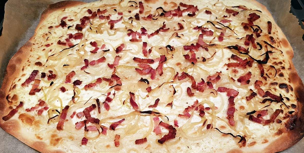 Faite maison comme je vous le propose, cette tarte flambée est délicieuse. La pâte est fine et croquante et la garniture aux oignons, lardons et crème lui donne toute sa gourmandise.