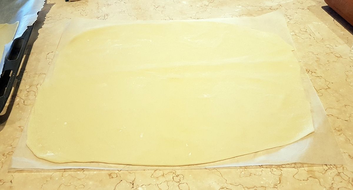 5) Préchauffer le four à 250°C. Sur une feuille de papier sulfurisé de la taille de la plaque, étaler la moitié de la pâte finement (environ 250g de pâte par plaque) à l'aide d'un rouleau à pâtisserie. Elle doit vraiment être bien fine.