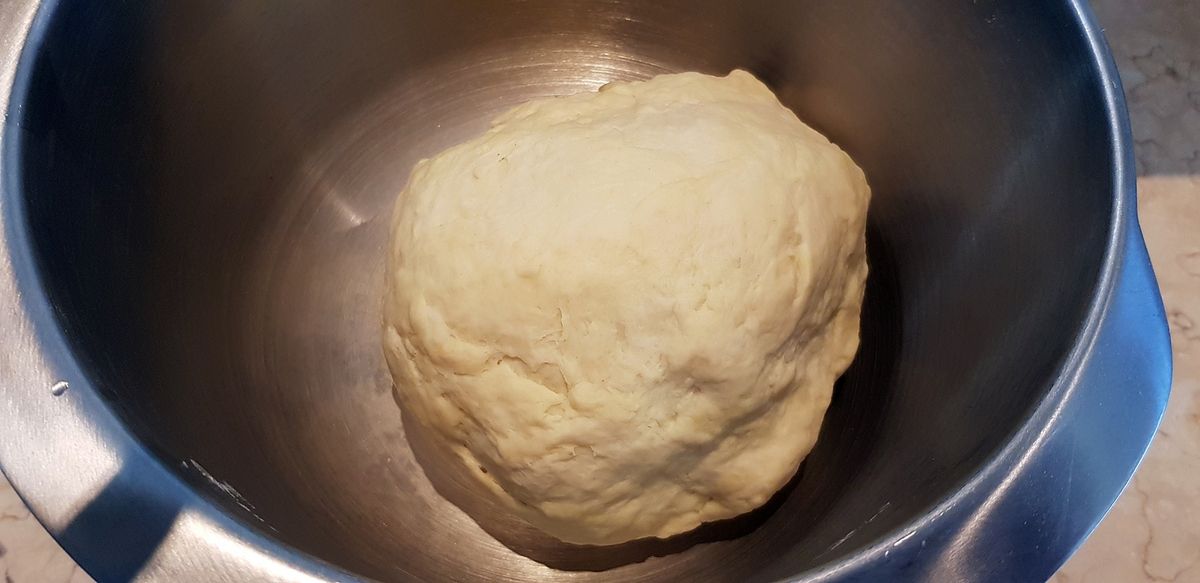 1) Préparer la pâte: dans le bol d'un robot, mettre la farine et le sel. Actionner le robot avec le crochet. Ajouter l'eau doucement et l'huile. Laisser le crochet pétrir la pâte quelques minutes. Elle doit être bien homogène et lisse. Il est également possible de préparer et pétrir la pâte à la main. La pâte doit se détacher facilement du crochet. Former une boule.