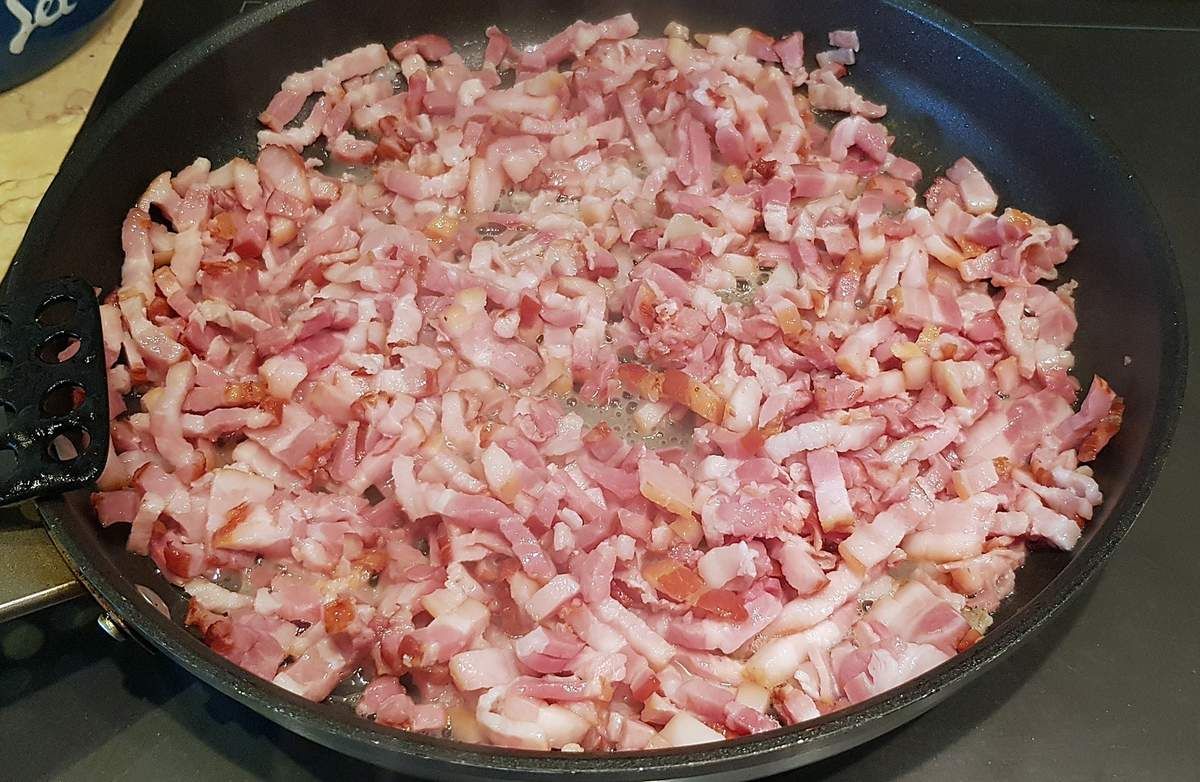 3) Dans la même poêle, faire rissoler les lardons quelques minutes, sans matière grasse ajoutée, en mélangeant. Réserver.