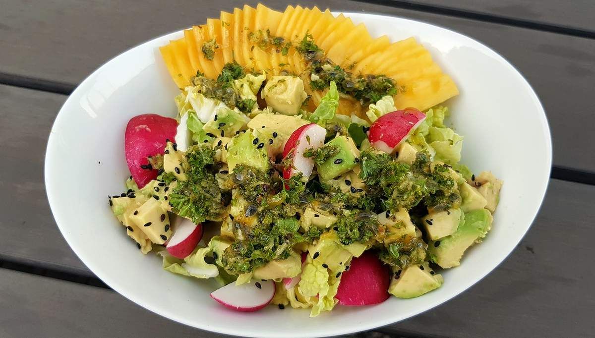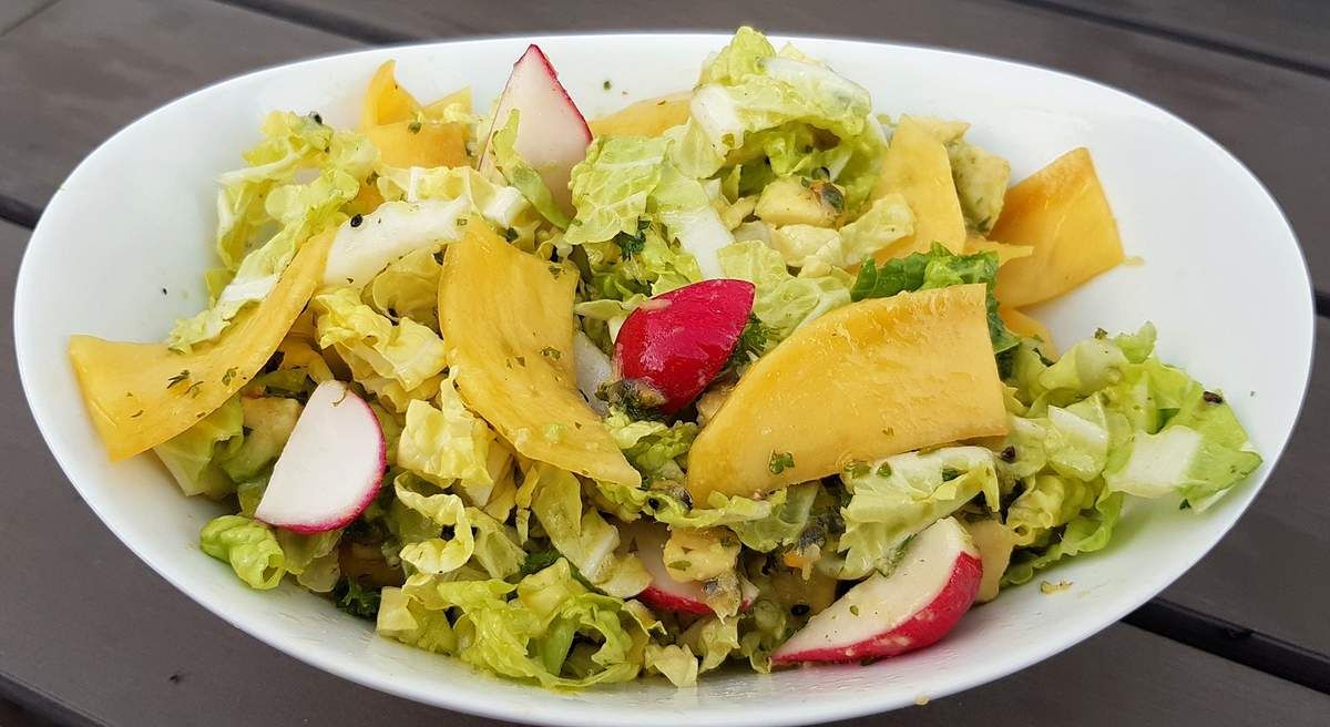 Et je la dois à mon Homme qui, frappé subitement par une illumination culinaire, a décidé de marier du chou chinois, de la mangue, de l'avocat et des radis. Avec une vinaigrette aux fruits de la passion, gingembre, persil et jus de citron vert. Résultat : une salade colorée, rafraîchissante, joyeuse et remplie de bonnes choses.