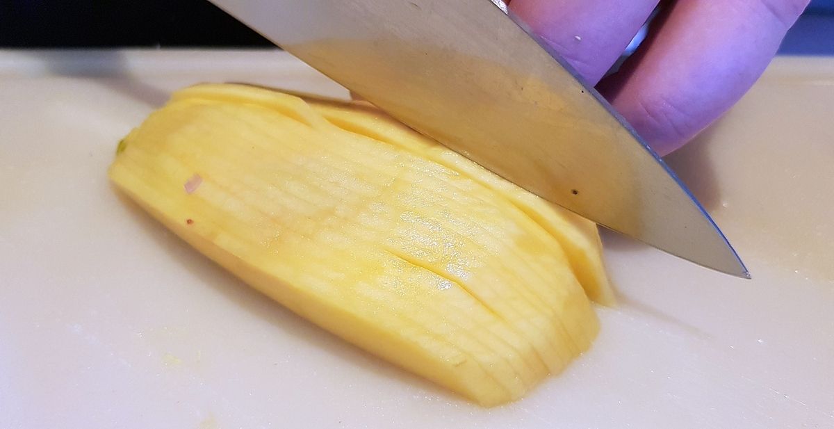 2) Peler la mangue avec un économe puis la couper en deux en passant autour du noyau. Découper chaque moitié finement en éventail puis en deux.