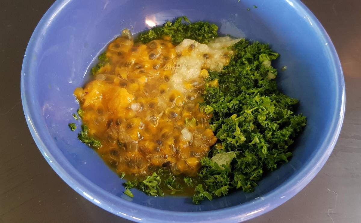 4) Préparer la vinaigrette: dans un bol, mettre le persil haché finement. Couper les fruits de la passion en deux et retirer la pulpe avec une cuillère. Mettre la pulpe dans le bol. Ajouter le jus de citron vert, la gousse d'ail pelée et passée au presse-ail, le gingembre pelé et râpé finement et l'huile d'olive. Saler, poivrer et mélanger. Ajouter un peu d'huile d'olive si la vinaigrette semble trop épaisse.