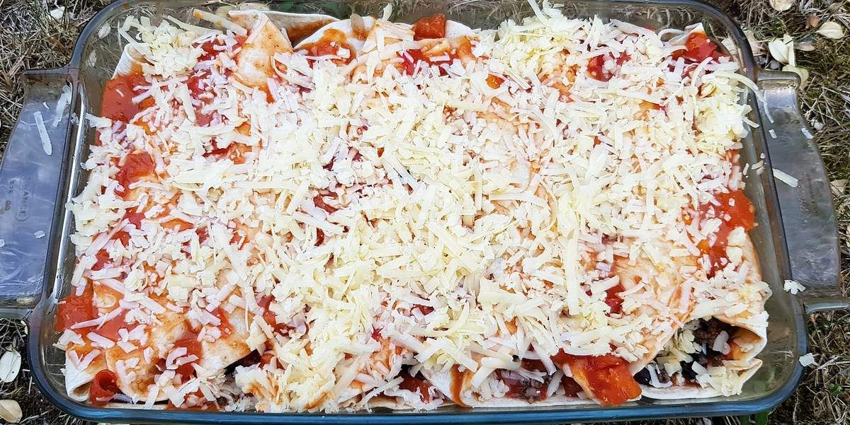 5) Lorsque toutes les Enchiladas sont posées dans le plat, les arroser de la sauce rouge restante et parsemer du reste de Cheddar.