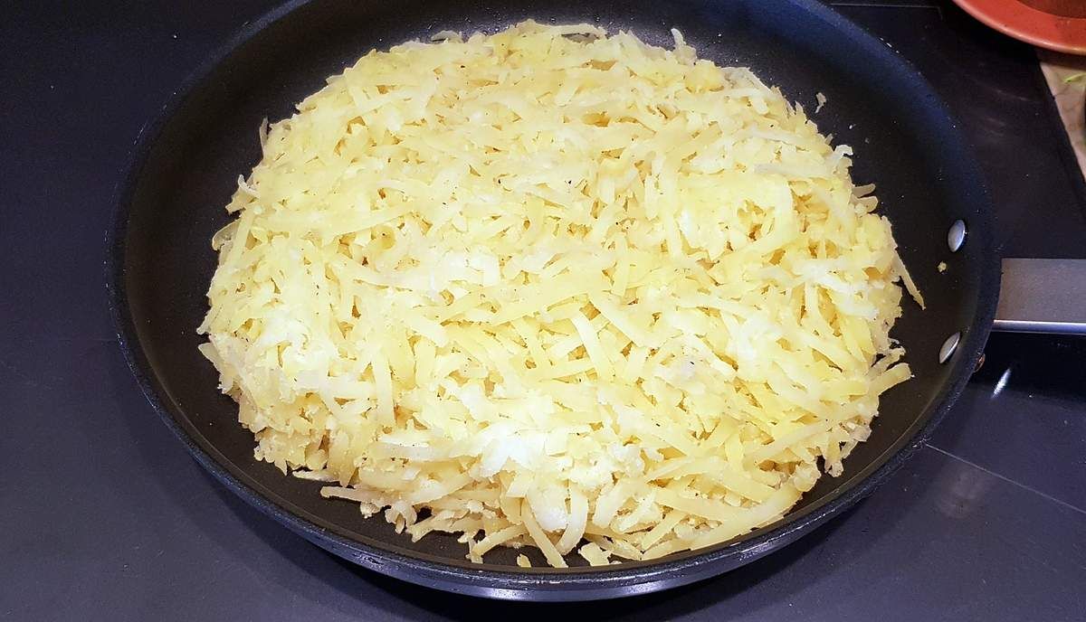 2) Le lendemain, peler les pommes de terre puis les passer à la râpe à rösti (râpe à gros trous). Donner quelques tours de moulin à poivre et saler (environ 1/2 càc). Mélanger délicatement avec les mains.