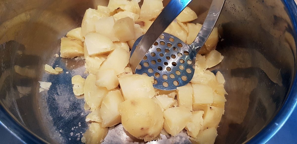 1) Passer les pommes de terre sous l'eau froide pour les nettoyer puis les plonger dans un casserole avec de l'eau froide. Porter à ébullition puis baisser le feu et les laisser cuire à frémissements entre 15 à 20 minutes jusqu'à ce qu'elles soient bien cuites. Vérifier la cuisson en plantant la lame d'un petit couteau à coeur. Egoutter les pommes de terre, les laisser brièvement tiédir puis les peler. Les écraser avec un presse purée et réserver.