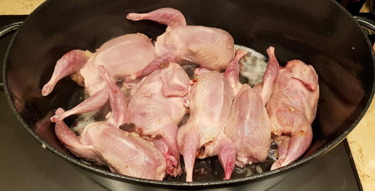 4) Dans une grande cocotte, faire revenir délicatement les cailles sur feu moyen vif dans un filet de beurre à rôtir de toutes parts jusqu'à ce qu'elles soient bien dorées. Cela prendra une dizaine de minutes. Saler et poivrer. Procéder en plusieurs fois si nécessaire, elles ne doivent pas se superposer. Réserver les cailles dans un plat.