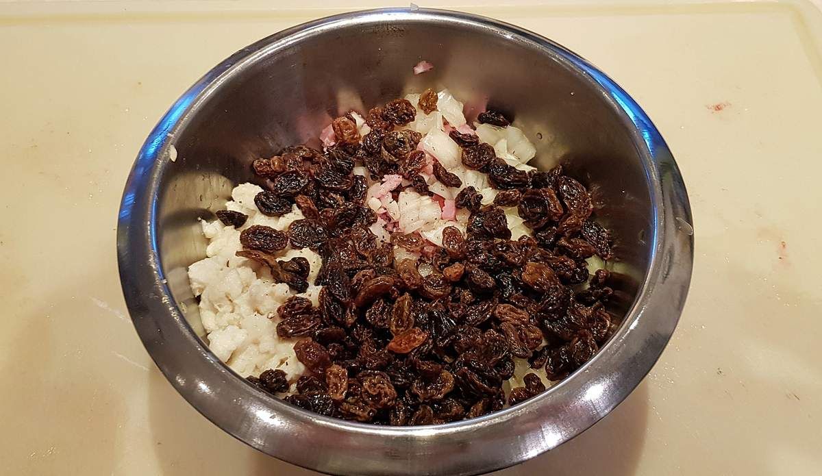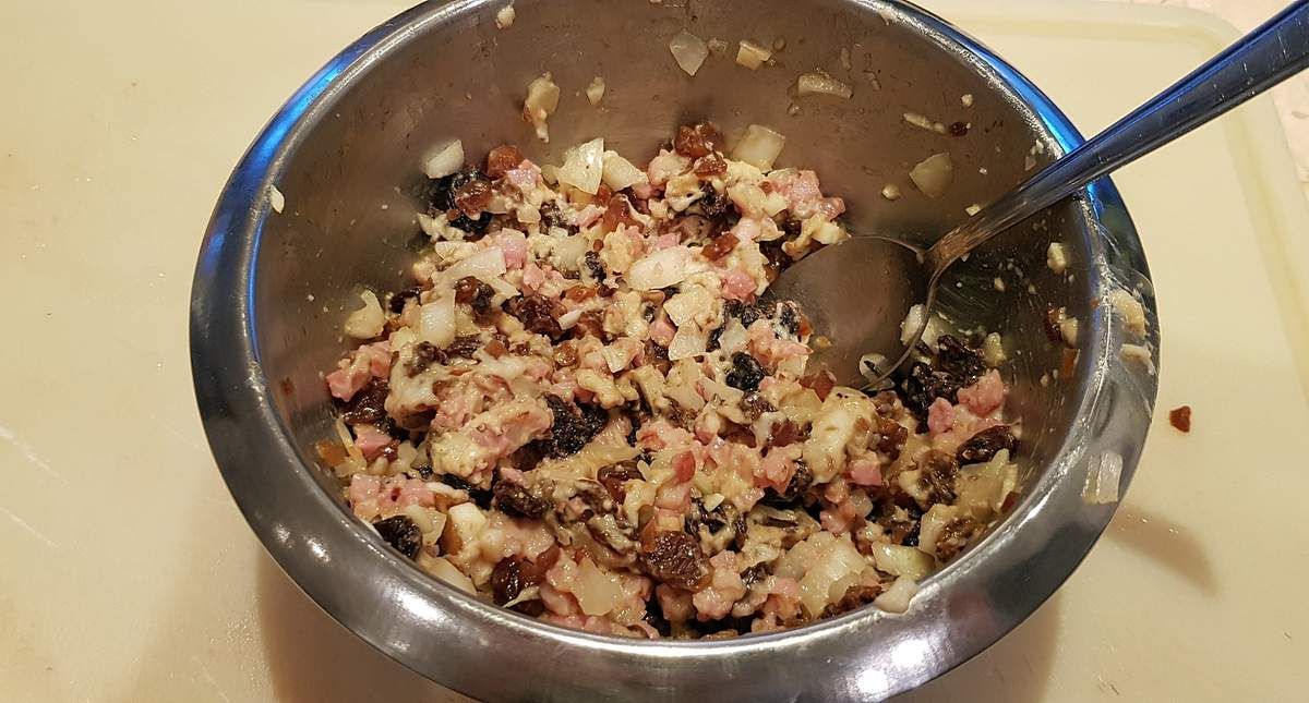 Mais je cherchais une farce qui n'en soit pas une. Hihihi. Et j'ai improvisé un mélange juste top avec des raisins secs, du cognac, des lardons, des châtaignes, de l'ail, de l'oignon et de la mie de pain. Et franchement, c'était EXTRA!