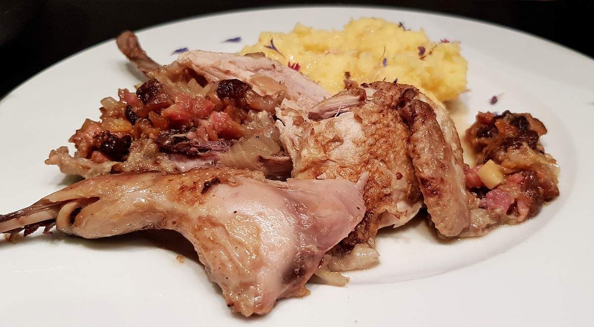 7) Pour servir, tirer sur les cuisses vers l'extérieur pour les détacher. Découper à la jointure au niveau du bréchet (os qui sépare les deux filets) pour décoller les blancs. Servir dans des assiettes avec la farce et un peu de jus. En accompagnement, une polenta, des pommes de terre, ce qui vous fait plaisir!