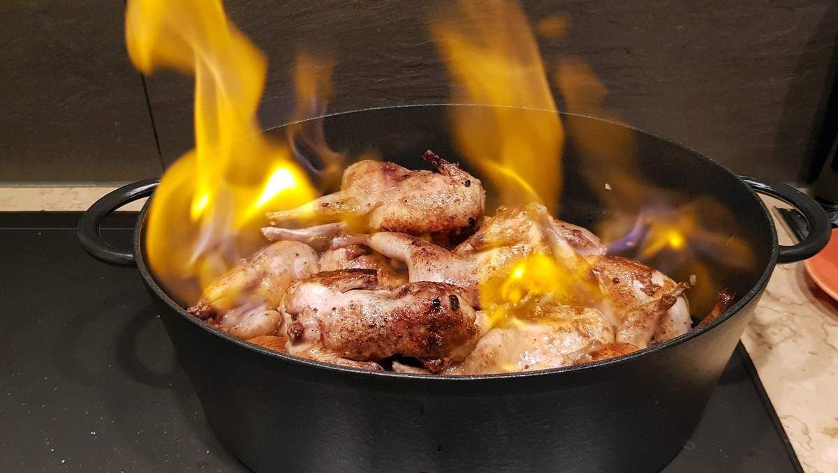 Allumer une grande allumette, verser le cognac dans la cocotte et flamber immédiatement. Laisser flamber sans toucher à la cocotte jusqu'à ce que toutes les flammes aient disparu !