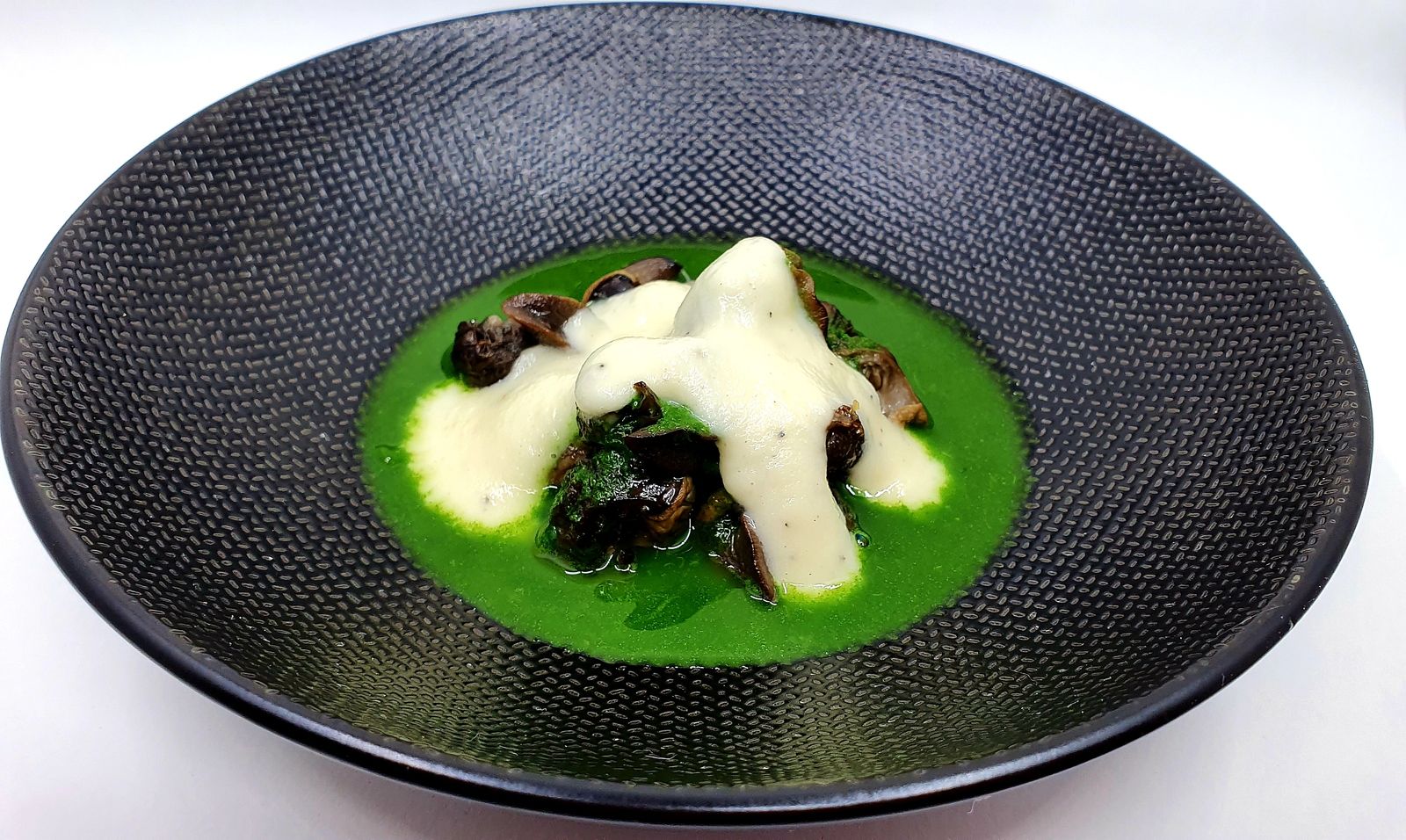 5) Dressage: dans une assiette creuse, déposer au centre les escargots. Verser délicatement environ une petite louche de jus de persil. Ajouter sur les escargots, au centre, environ 2 cuillères à soupe de crème d'ail, joliment. Servir de suite!