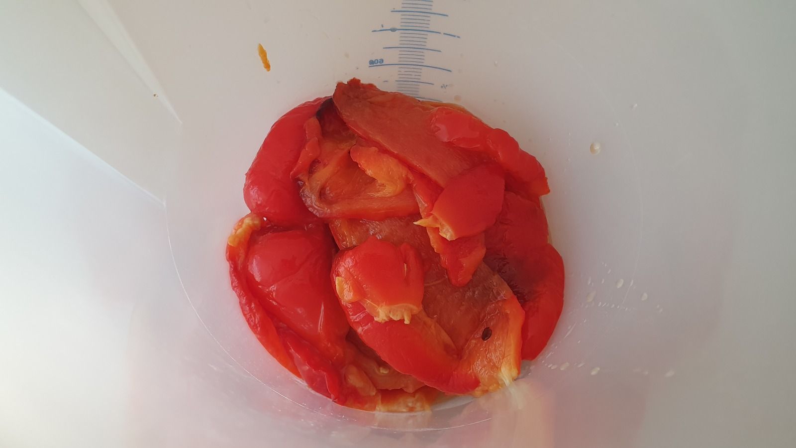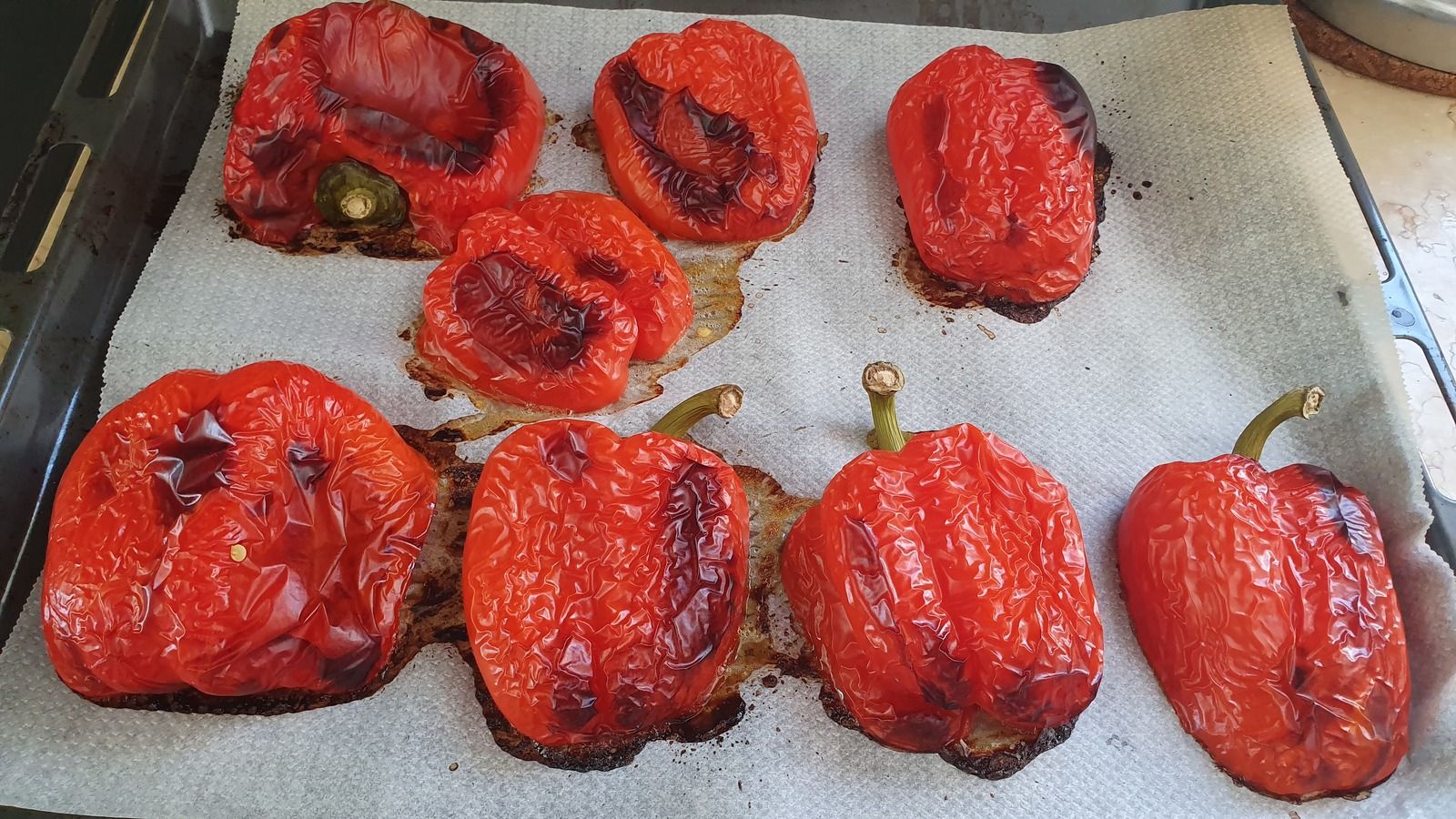 1) Passer les poivrons sous l’eau froide, les essuyer. Les couper en deux et les mettre sur une plaque recouverte de papier sulfurisé. Les cuire environ 30 à 40 minutes dans le milieu du four préchauffé à 200°C, jusqu’à ce que la peau noircisse un peu. Mettre les poivrons dans un saladier et recouvrir de papier film (ou les enfermer dans un sachet de congélation). Laisser les poivrons tiédir ainsi durant au moins 30 minutes. La peau se détachera alors facilement.