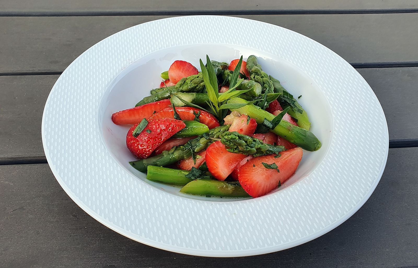 4) Juste avant de servir, mélanger encore la vinaigrette et l'ajouter aux fraises et asperges. Bien mélanger. Servir dans des assiettes creuses avec quelques brins d'estragon en décoration. Si le coeur vous en dit, vous pouvez ajouter un trait de balsamique sirupeux sur la salade.