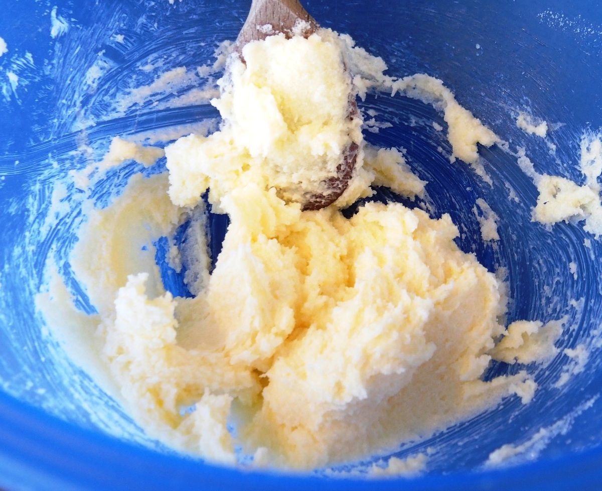 2) Dans un grand récipient, mettre le beurre et le sucre. A l'aide d'une spatule en bois, bien mélanger les deux ingrédients et appuyant jusqu'à ce que le sucre soit bien intégré au beurre. Préchauffer votre four à 180°C.