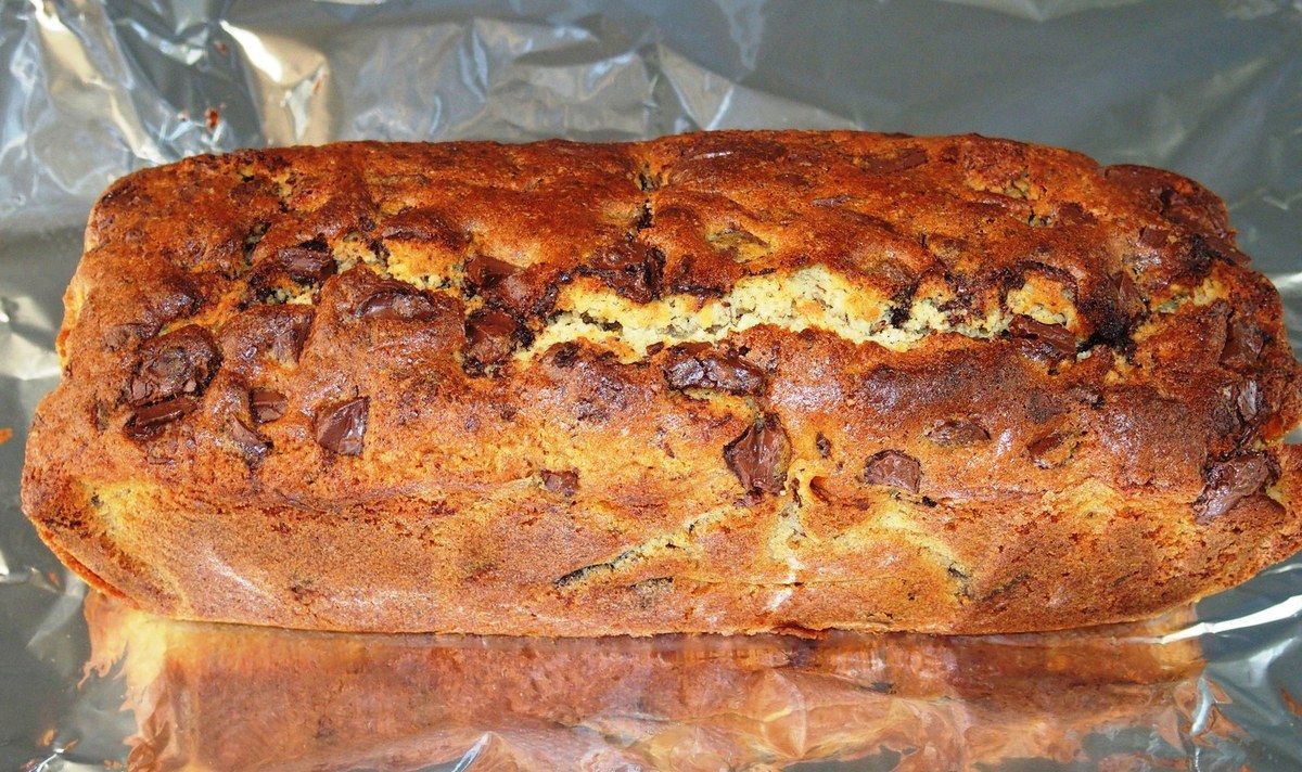 5) Enfourner dans la partie moyenne du four durant environ 45 minutes à 180°C. Recouvrir le cake avec une feuille d'aluminium s'il brunit trop. Pour vérifier la cuisson, planter la lame d'un petit couteau. Elle doit ressortir propre. Enfin, s'il y a un peu de chocolat fondu sur la lame, c'est normal :-))