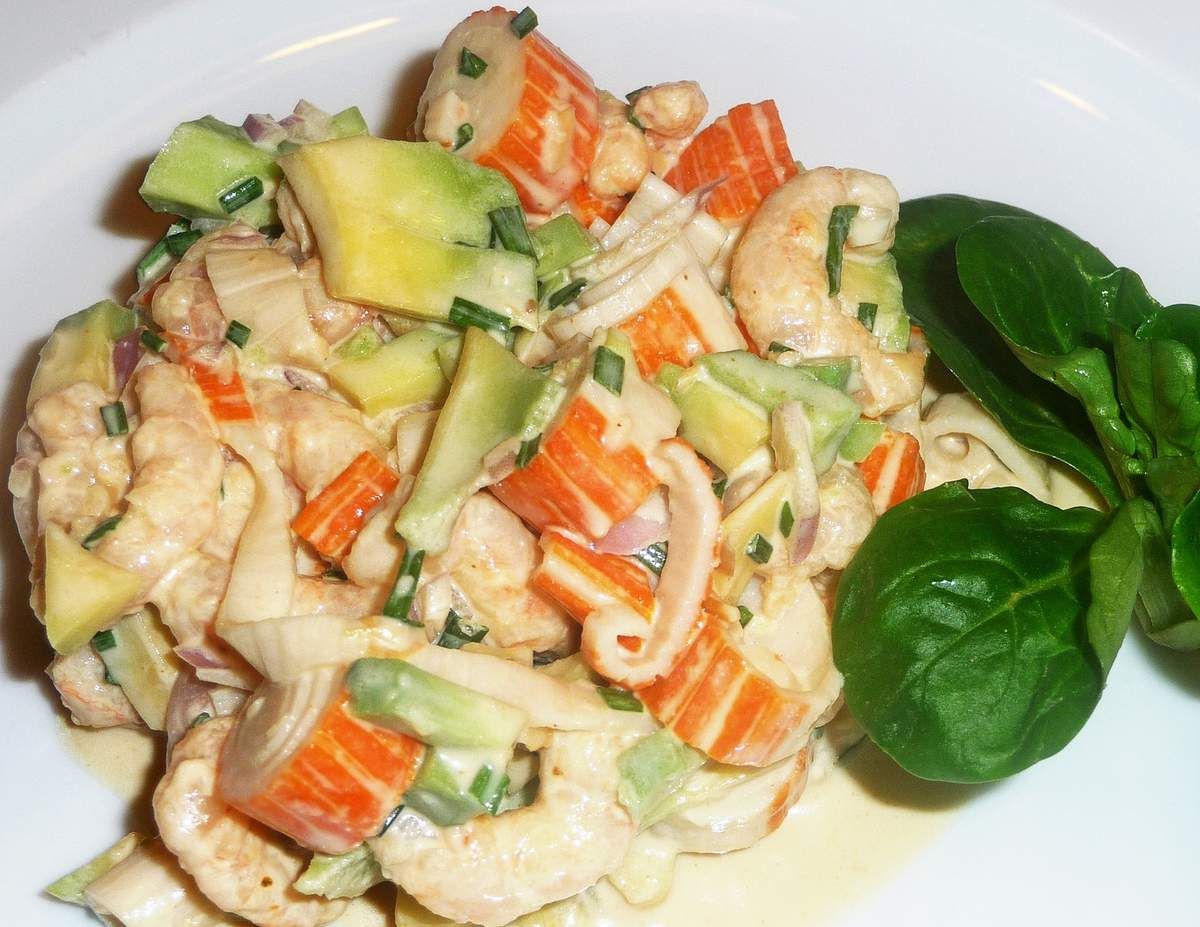 1) Couper le surimi en petits morceaux. Egoutter les crevettes. Couper l'avocat en petits morceaux. Mettre tous ces ingrédients dans un plat. Arroser de jus de citron et mélanger.