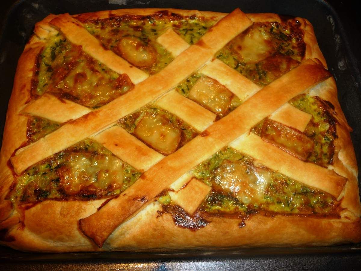 6) Préchauffer votre four à 200°C. Avec un petit couteau, couper la pâte sur le plat du moule et rabattre les bords sur la farce. Découper des languettes dans le reste de la pâte et déposer en croisillons sur la farce. Déposer des lamelles de gruyère dans les interstices. Tremper dans de l'eau froide un pinceau et badigeonner les lamelles de pâte.