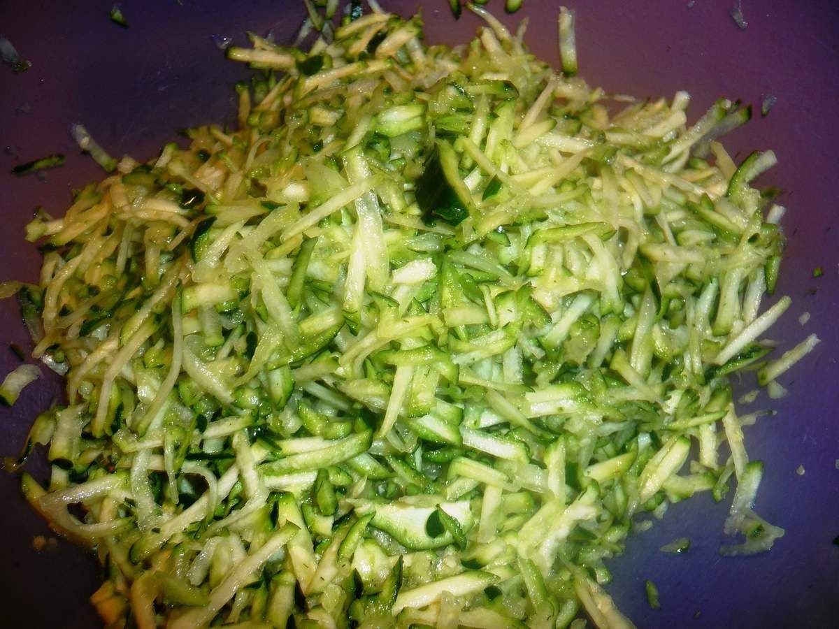 2) Laver les courgettes, couper les extrémités. Râper à la râpe à rösti par exemple. Hacher l'oignon et émincer l'ail.