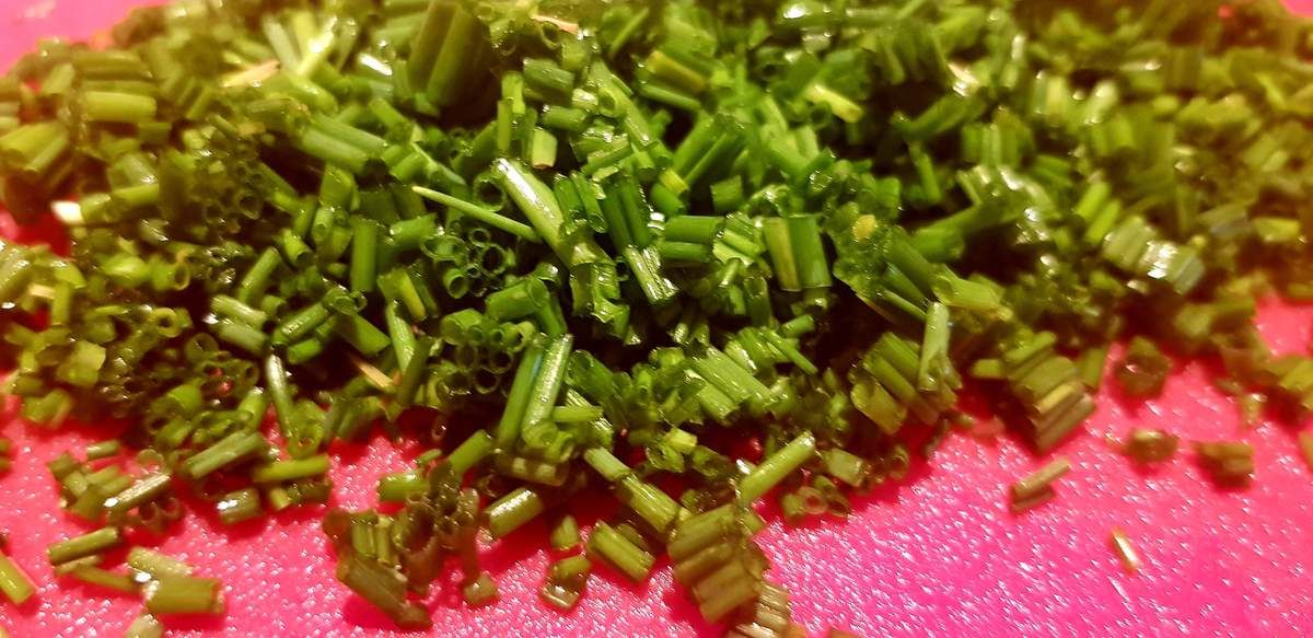 4) Diluer la fécule avec une fourchette dans la crème froide et ajouter. Ajouter la ciboulette ciselée. Mijoter sur feu doux quelques minutes, le temps que la sauce épaississe.