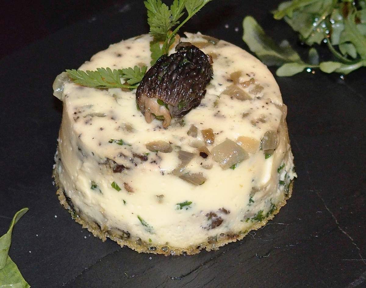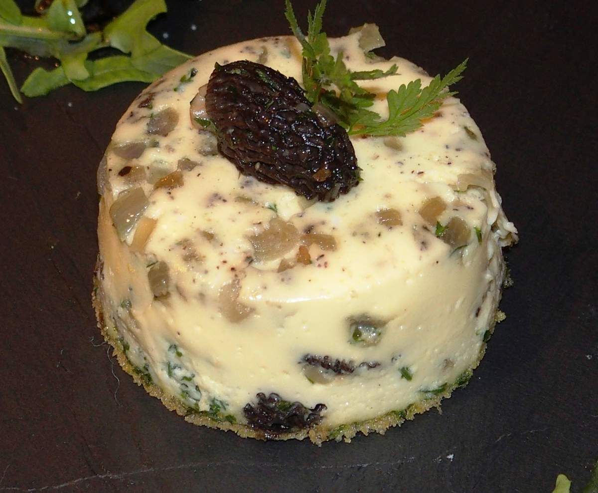 8) Sortir du plat et laisser tiédir environ 15 à 20 minutes. Déguster tiède à chaud. Glisser la lame d'un couteau sur tout le bord délicatement pour démouler. Essayer de glisser un peu la lame dans le fond pour faire le vide d'air en retournant le moule pour que le flan tombe doucement. Placer une morille sur le flan, saupoudrer d'une légère pincée de fleur de sel ou de sel et servir avec une salade verte agrémentée d'un peu d'huile de noix, sel et vinaigre balsamique.