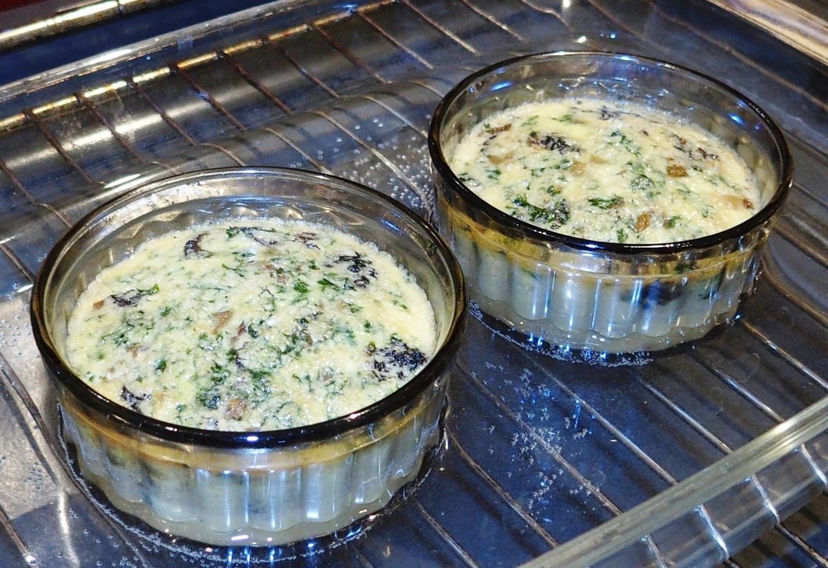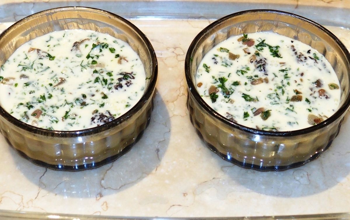 5) Pour beurrer les moules et faciliter le démoulage: beurrer le fond des moules. Pour les bords, beurrer depuis le fond vers l'extérieur sur tout le bord, soit dans le sens du démoulage. Placer les moules dans un petit plat à gratin. Répartir le mélange crème-oeufs dans les moules ou ramequins aux 2/3. Ajouter et répartir les morilles persillées (en garder une par personne pour le décor) et mélanger doucement à l'aide d'une fourchette. Ne pas hésiter à mettre toutes les échalotes et le persil qui pourraient rester dans le récipient. Mettre de l'eau bien chaude du robinet dans le plat à gratin jusqu'à la moitié des ramequins.