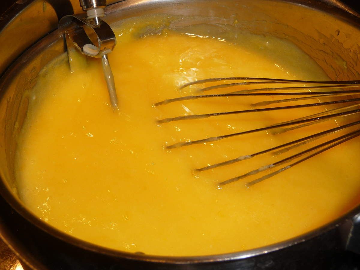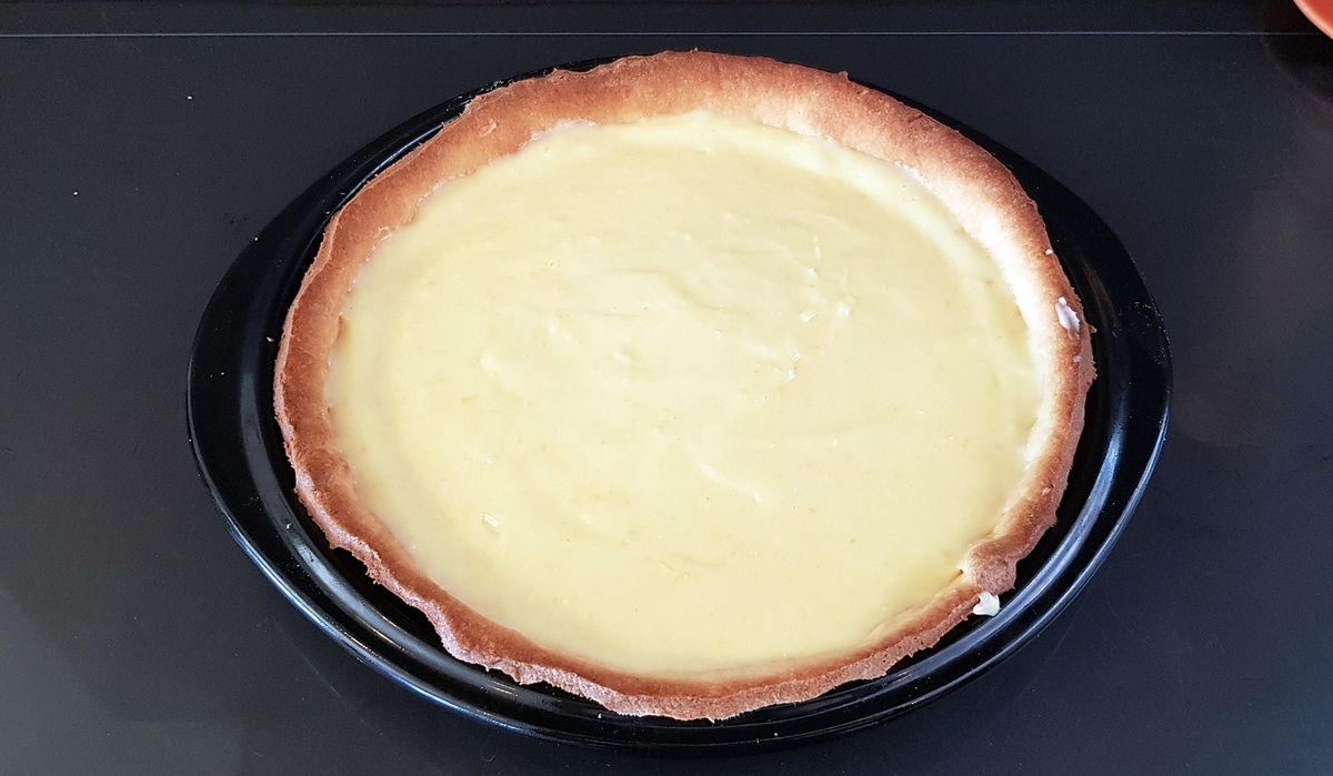 3) Fouetter un peu la crème au citron refroidie et verser sur la pâte. Lisser un peu le dessus.