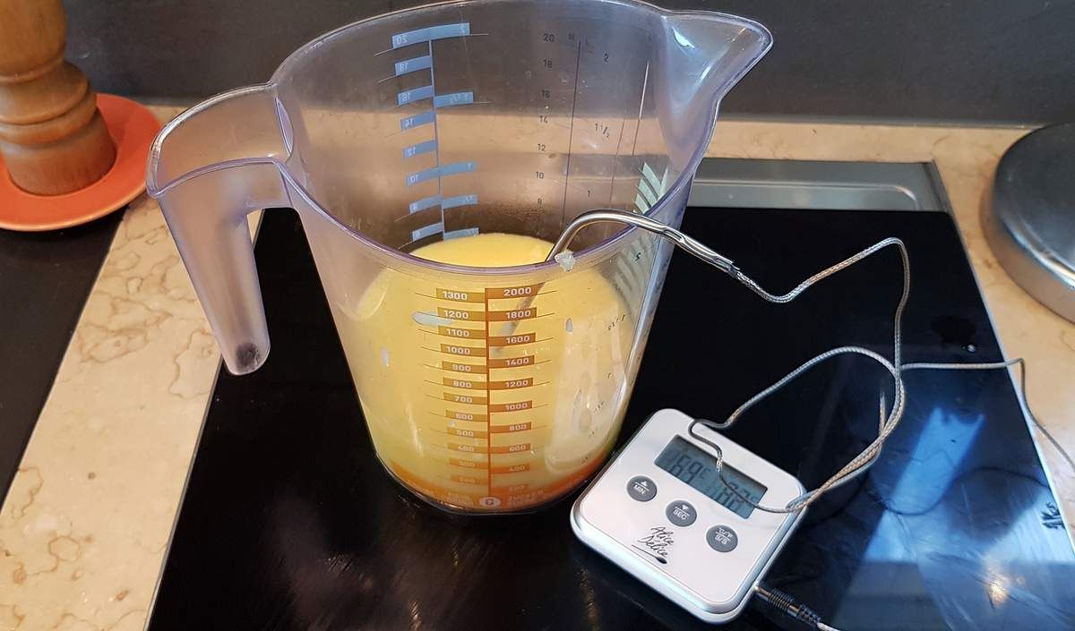 La crème va épaissir en 10 à 15 minutes. Il est important de mélanger souvent. Dès qu'elle est assez épaisse, vous pouvez retirer la casserole du feu et la mettre dans un récipient. A noter que la température idéale à atteindre est de 82°C, raison pour laquelle j'ai utilisé un thermomètre (ainsi les oeufs ne peuvent pas coaguler). Mais si vous n'en avez pas, retirez-la lorsque la consistance devient assez épaisse.