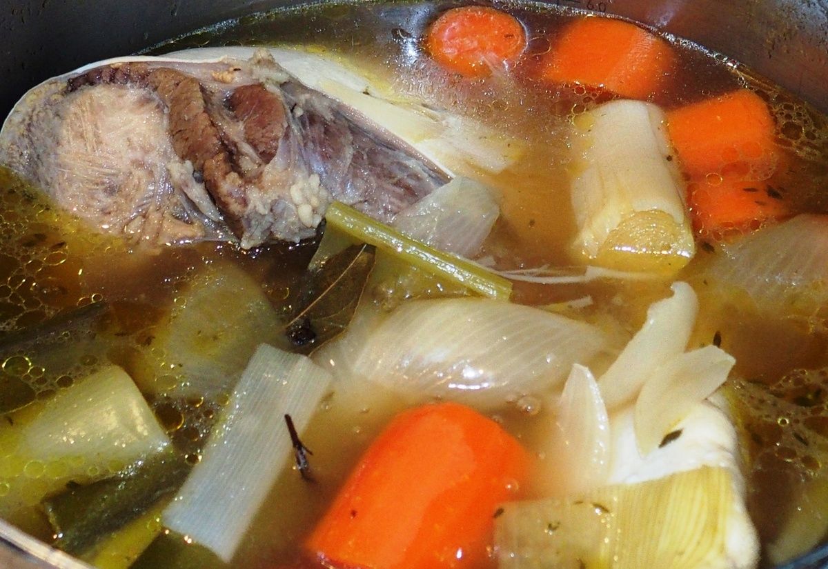 7) Après 3 heures de cuisson, mettre 1 litre de bouillon dans une casserole en le filtrant dans une petite passoire ou un chinois. Laisser les légumes dans la grande casserole.