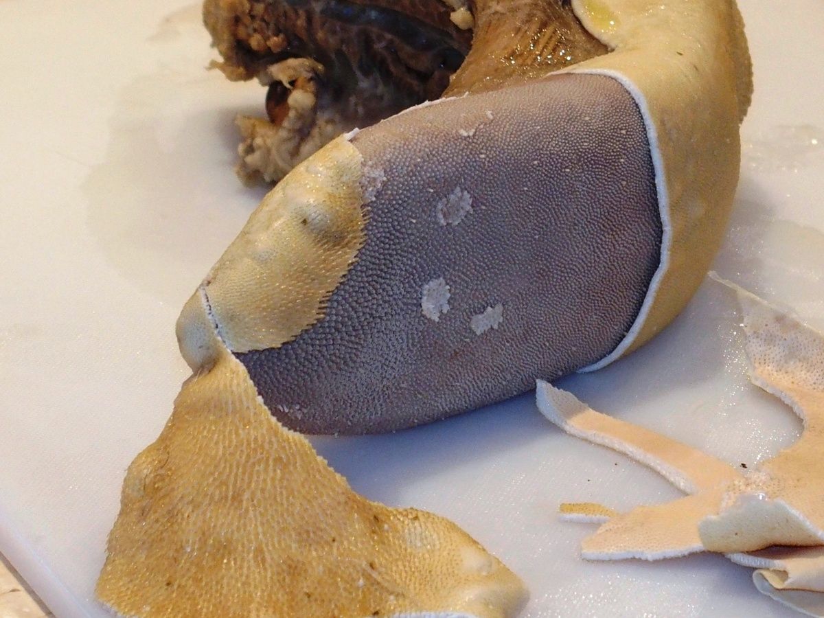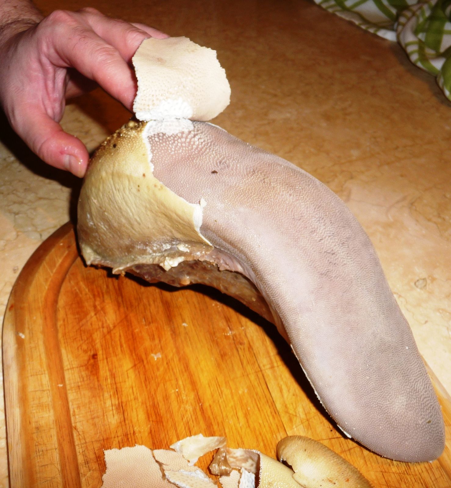 Sortir la langue, la laisser tiédir et la peler. Enlever à l'aide d'un petit couteau la peau "caoutchouc" ainsi que les bords irréguliers.