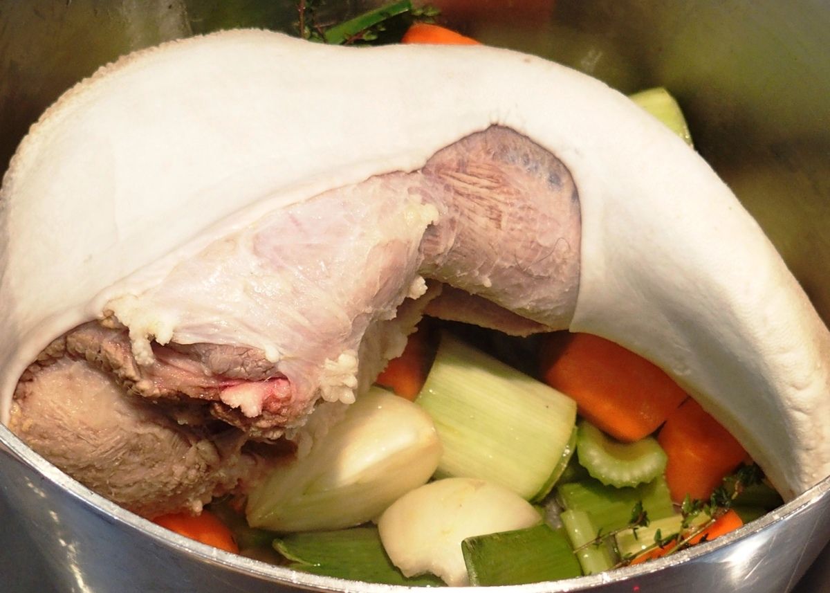6) Recouvrir d'eau (environ 4 litres). Ajouter les cubes de bouillons. Porter à ébullition, goûter et rectifier l'assaisonnement (sel), laisser cuire 3 heures à couvert