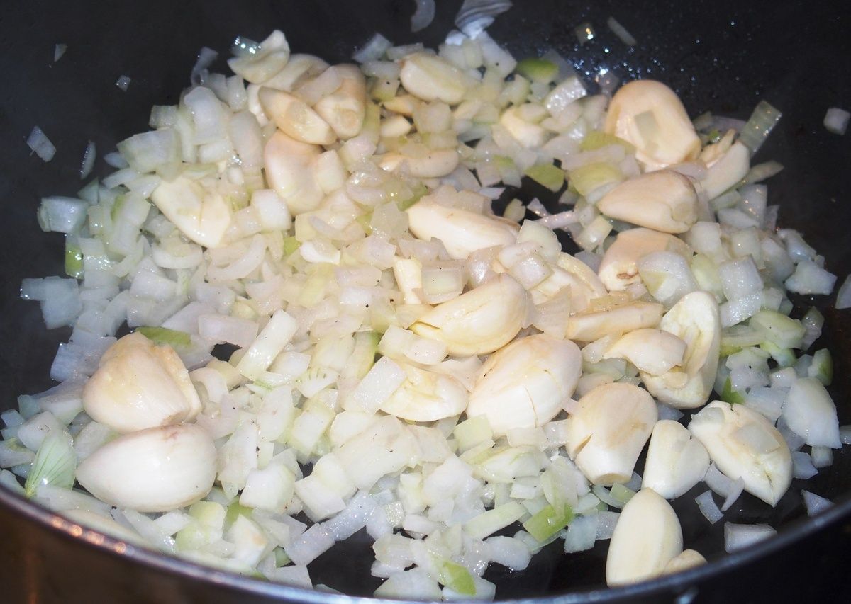 2) Peler les 30 gousses d'ail, les laisser entières, en réserver 2 de côté. Peler les 2 gros oignons et les émincer. Dans le même faitout, remettre à chauffer un peu de l'huile à rôtir. Faire revenir l'oignon 3 minutes, puis ajouter les gousses d'ail (28), le concentré de tomates, le vin, 4 branches de thym et les feuilles de laurier. Laisser réduire quelques minutes à feu moyen après l'ébullition.