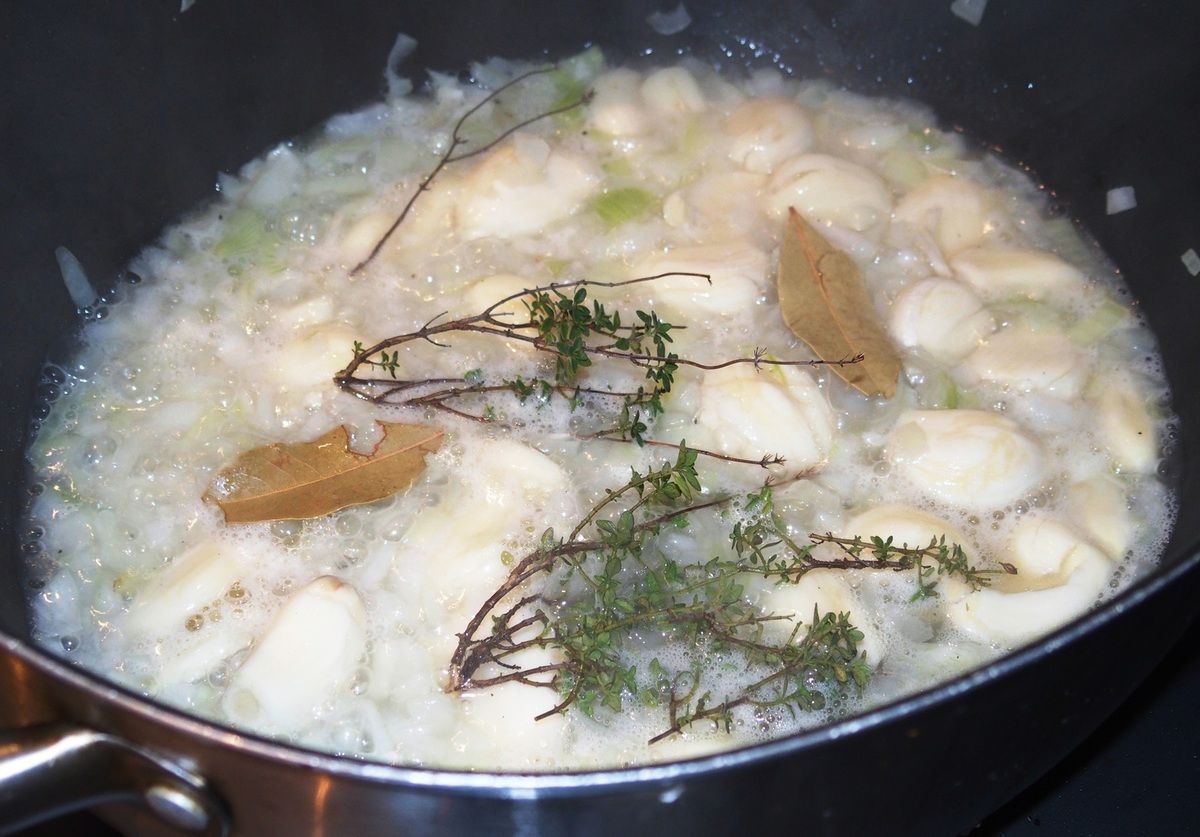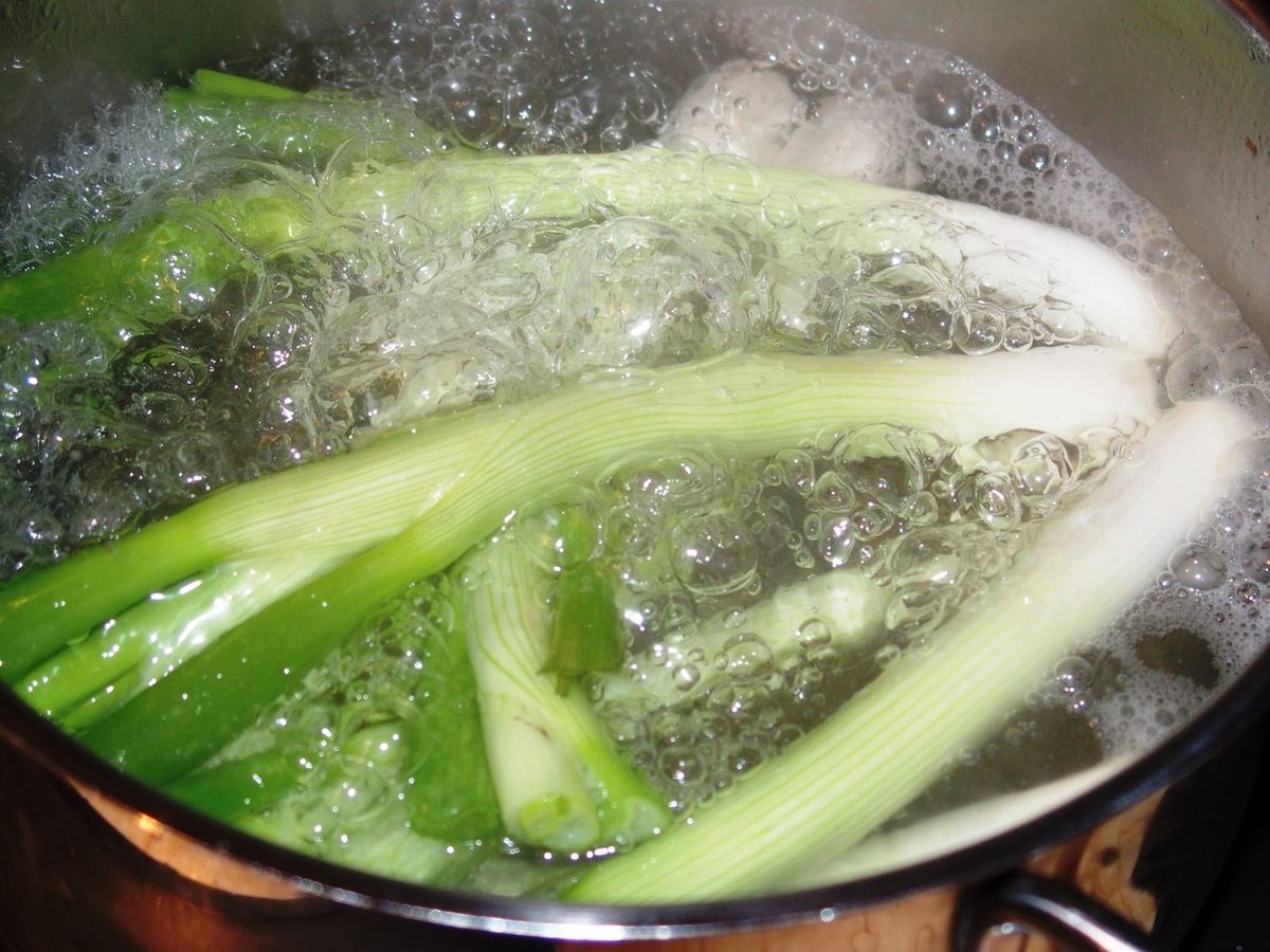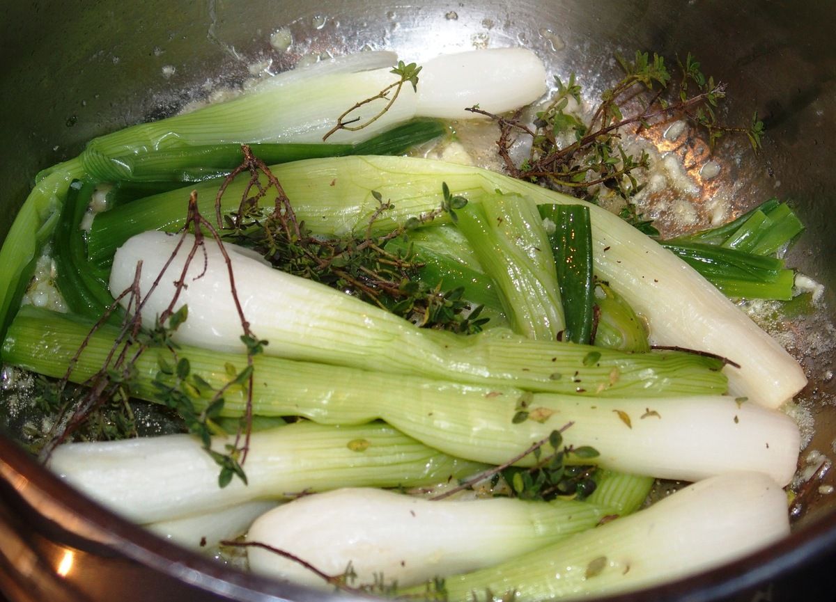 4) Pendant ce temps, prendre les oignons nouveaux et couper les tiges vertes de façon à laisser environ 4 cm. Dans une petite casserole, mettre de l'eau à bouillir avec du sel et blanchir les oignons nouveaux environ 3 minutes. Jeter l'eau et égoutter les oignons. Dans la même casserole, mettre 25g de beurre à fondre. Ajouter les oignons nouveaux, le reste des branches de thym et les deux dernières gousses d'ail passées à travers un presse-ail. Couvrir et laisser cuire sur feu doux 10 minutes. Retirer du feu et réserver.