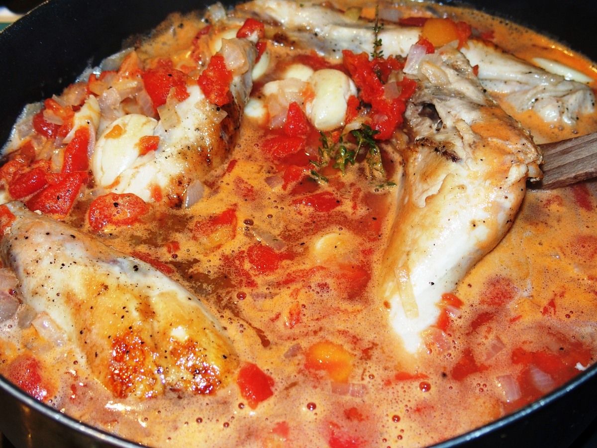 3) Dans le faitout, ajouter un litre d'eau chaude, les cubes de bouillon et les tomates. Remettre les morceaux de lapin. Bien mélanger, porter à ébullition, couvrir et laisser cuire 45 minutes à feu doux.