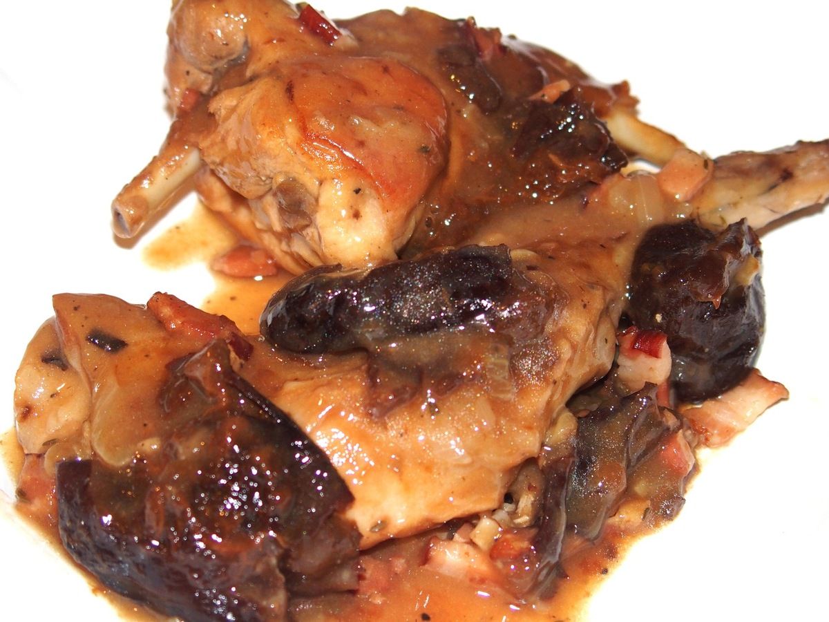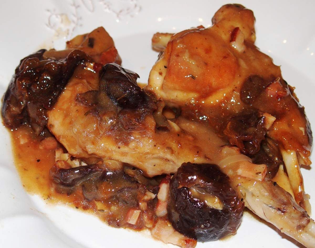 Allez allez, venez encore avec moi dans le nord de la France. Chez les Ch'tis et leurs délicieuses recettes. Ce lapin est un régal. Vous vous demandez peut-être si le tout a vraiment un goût de pruneaux. Eh bien non, cela reste très subtil et c'est ça qui est très intéressant. La préparation est simple et le résultat extra. Cela change de nos façons à nous de cuisiner le lapin. Là, il est cuit au vin blanc et au cidre. Mais vous pouvez aussi utiliser que du vin blanc ou de la bière ou seulement du cidre. Ou de l'eau. Moi je le préfère comme ça, à vous d'essayer de différentes façons.