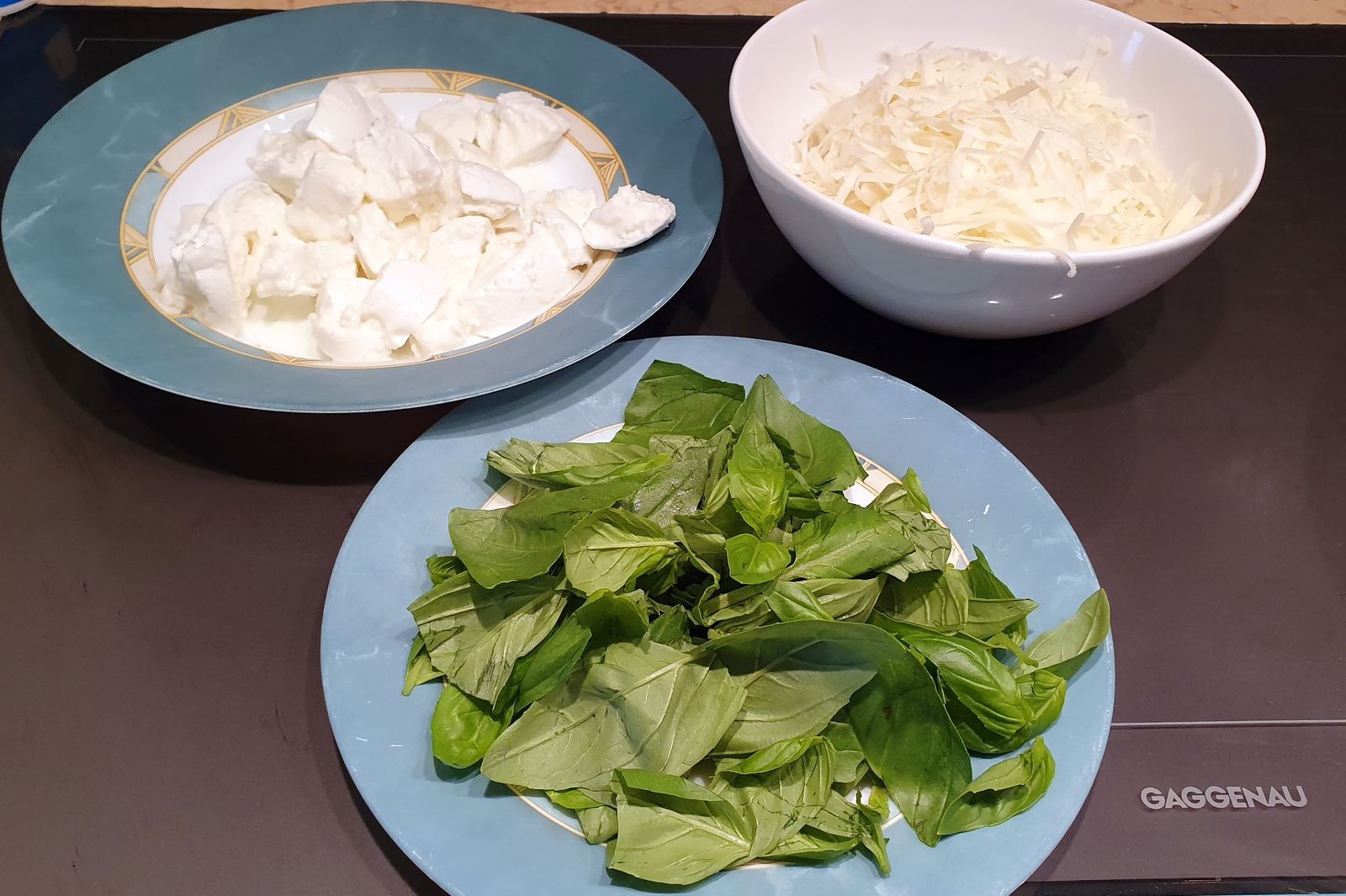 5) Pendant ce temps, couper la mozzarella en dés, râper grossièrement le parmesan et ciseler, également grossièrement, le basilic (couper en 2 les plus grosses feuilles avec les doigts). Réserver.
