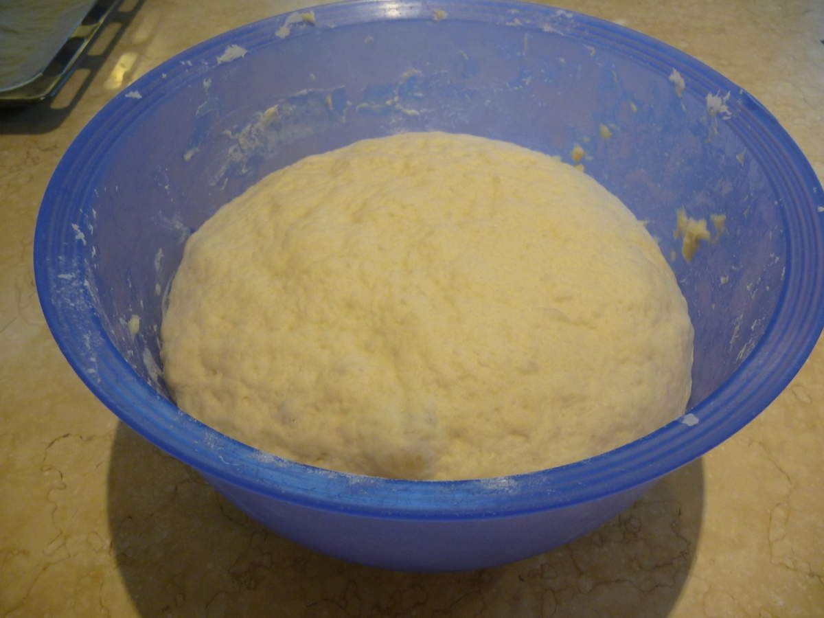 2) Dans un grand récipient, mettre le lait, la levure émiettée, le sucre et le beurre en petits morceaux, mélanger. Ajouter la farine et pétrir la pâte jusqu'à ce qu'elle soit lisse et homogène. DEFOULEZ-VOUS! Rassembler la pâte en boule et la laisser dans le récipient recouvert d'un linge, à température ambiante.